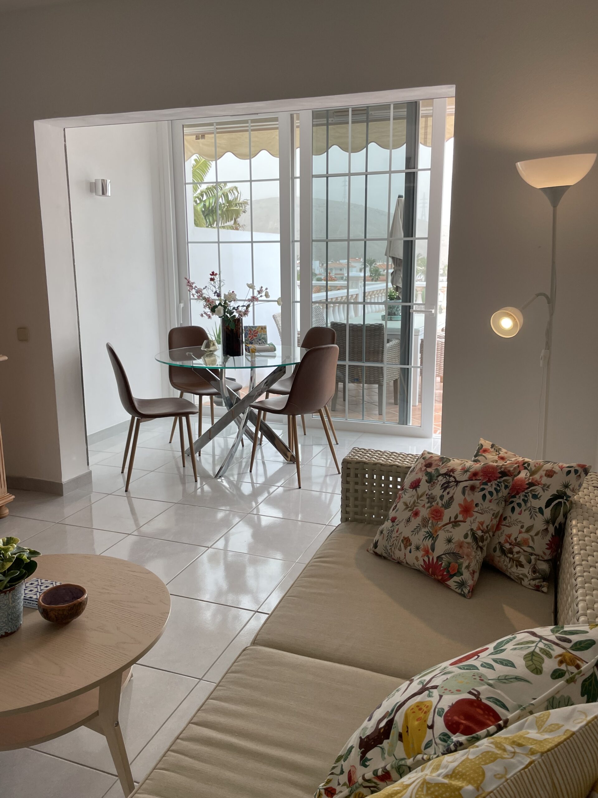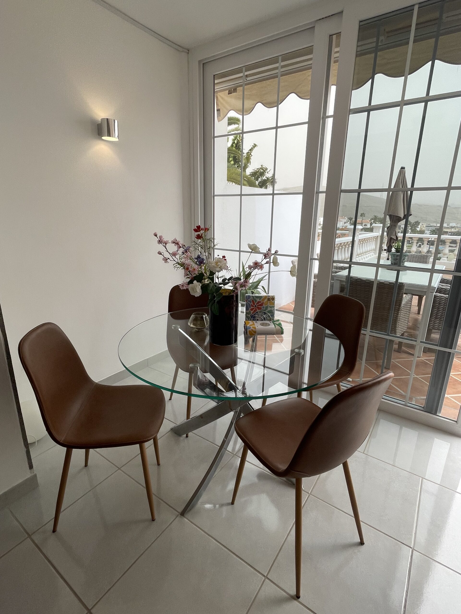Begge leilighetene har store terrasser med utsikt til havet og over Loma Dos, samt en liten sittegruppe hver på hhv. siden og foran av bygget. Stor, praktisk markise ut i fra stuen i begge enhetene.