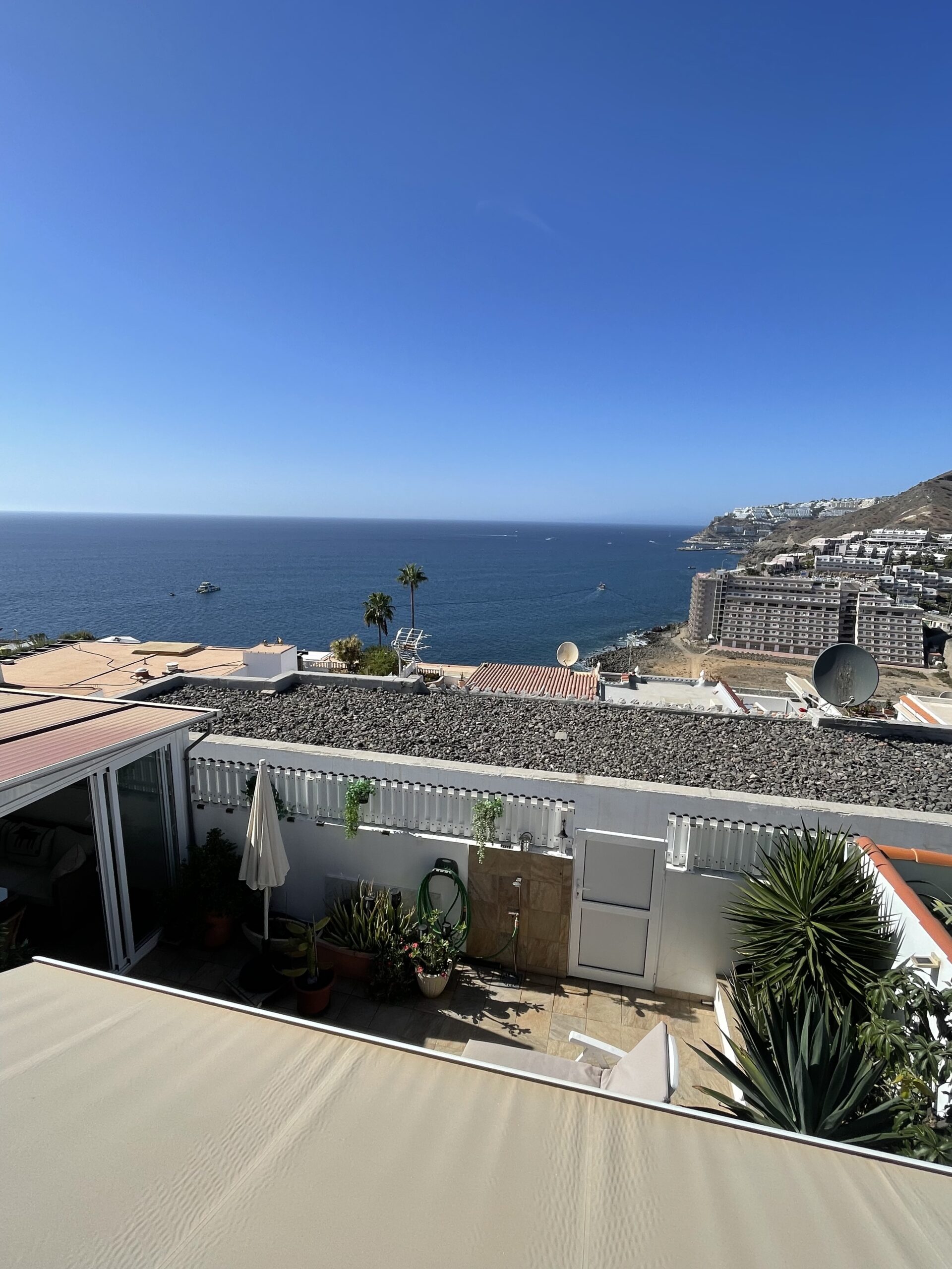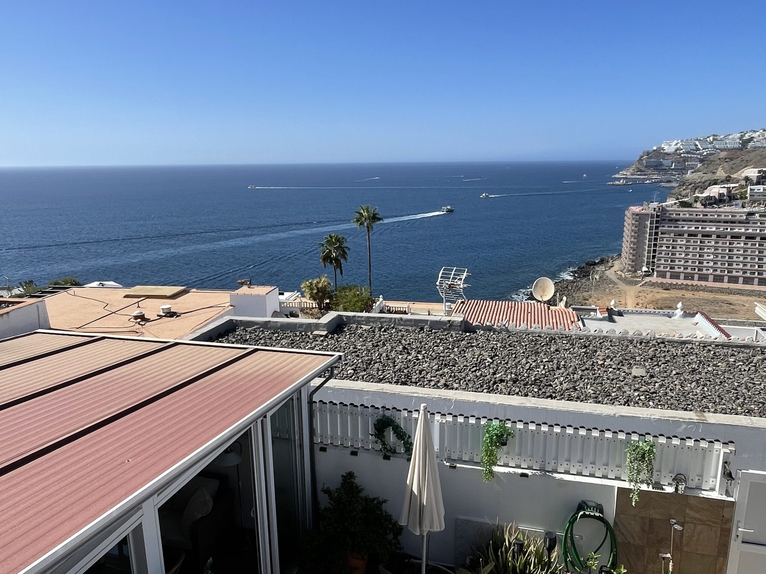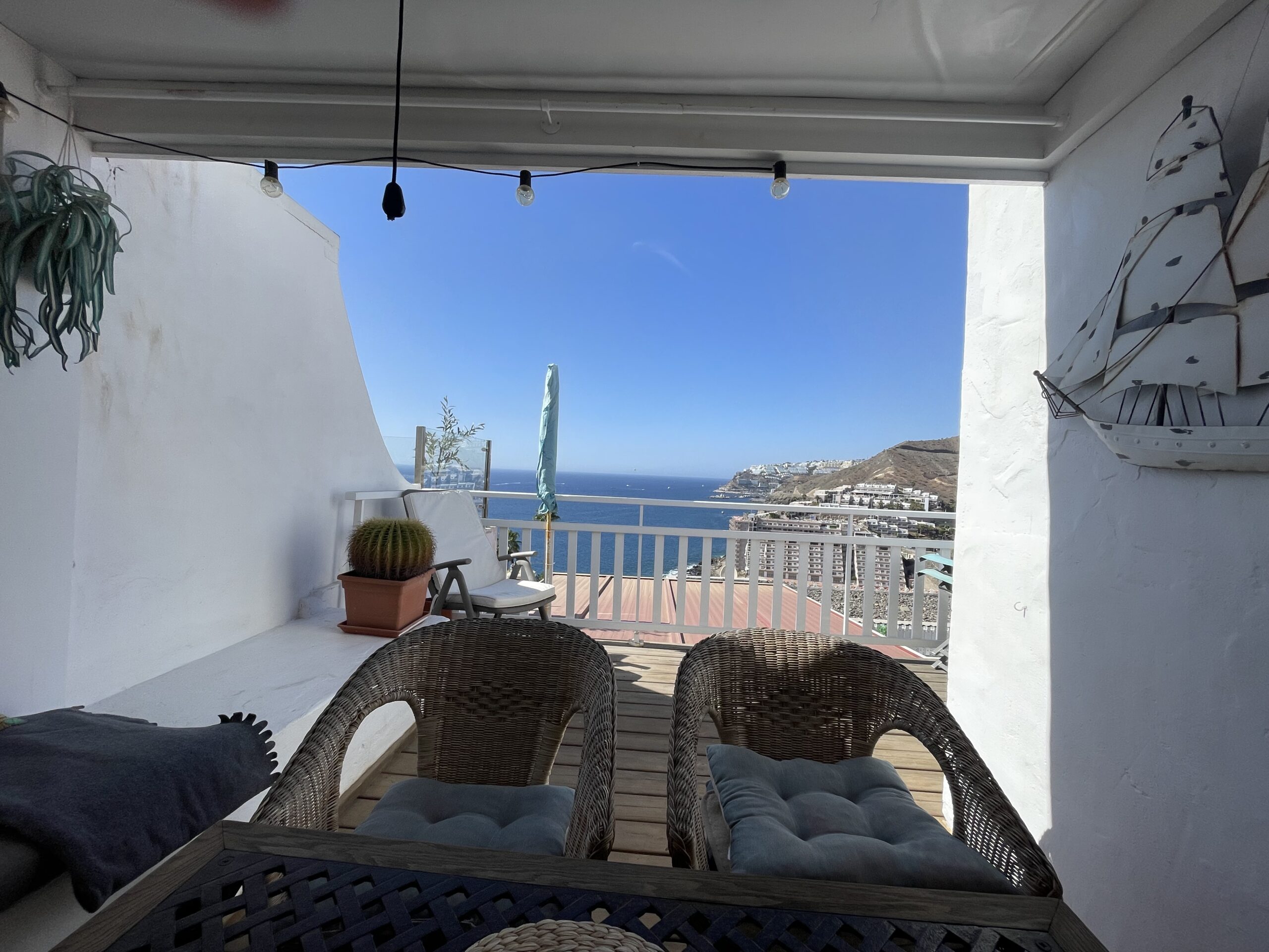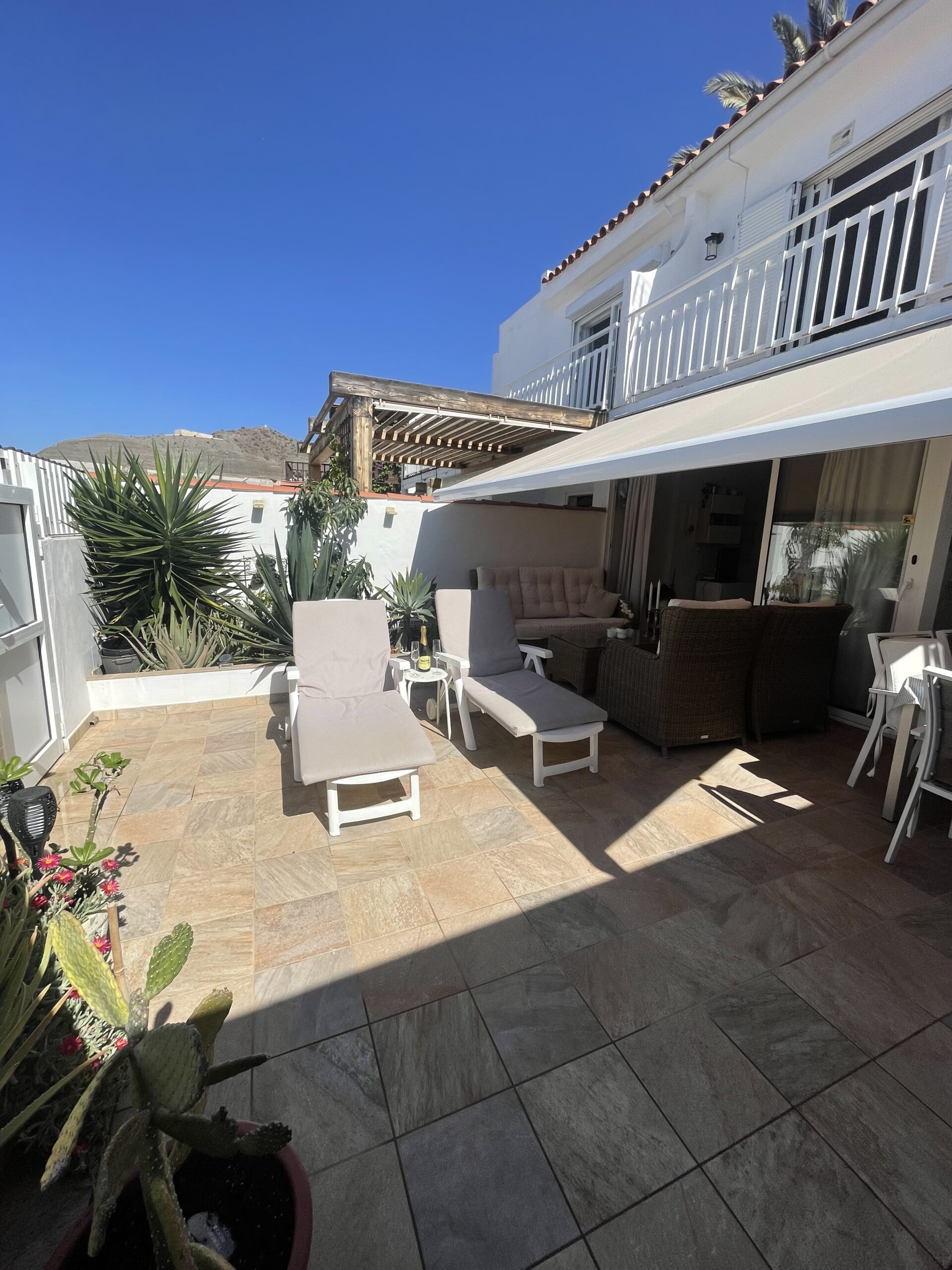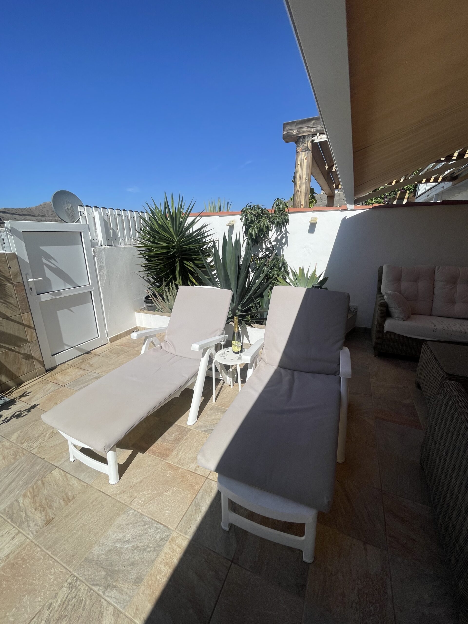 Lys og lekker rekkehusleilighet over to etasjer med flott beliggende i det populære Los Caideros-området, rett bak Anfi Del Mar-anlegget mellom Arguineguin og Puerto Rico.