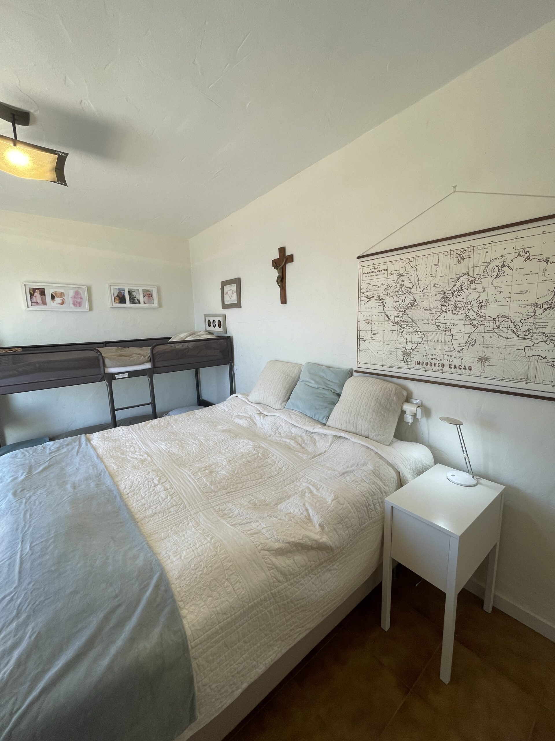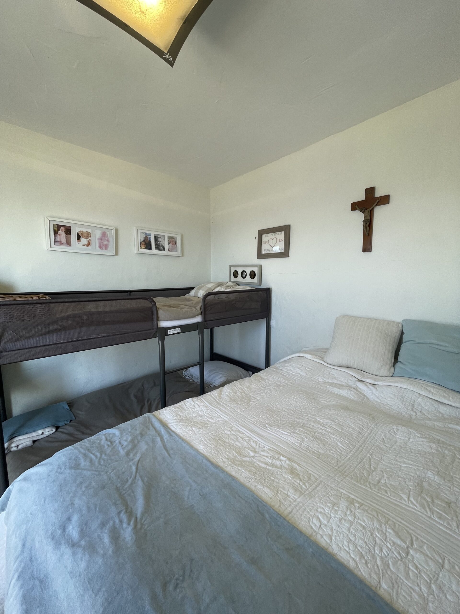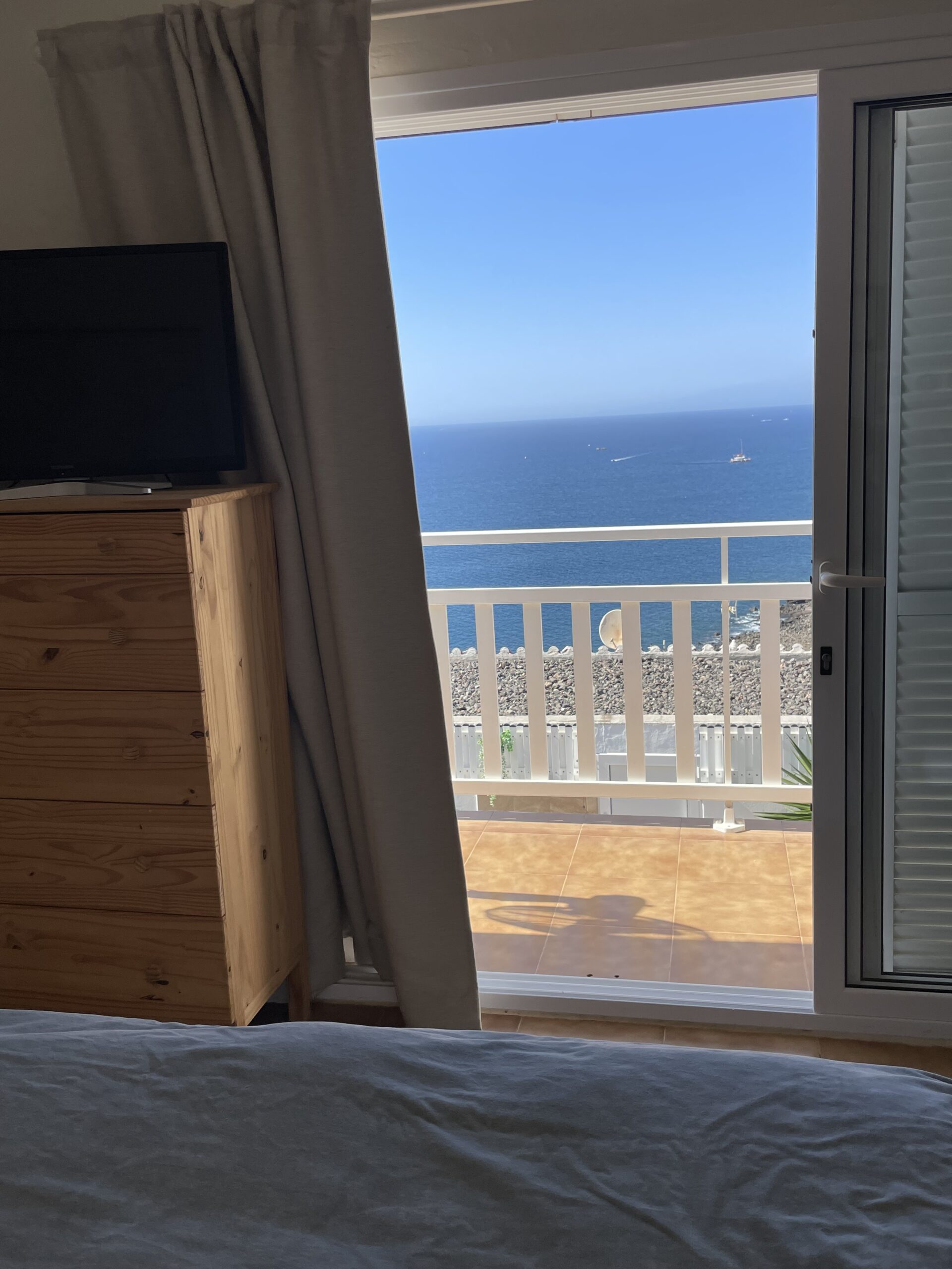 -1 stort soverom med dobbeltseng, køyeseng, TV (+chromecast) og garderobeskap. Rommet har direkte utgang til stor balkong og ekstra utestue med flott havutsikt.