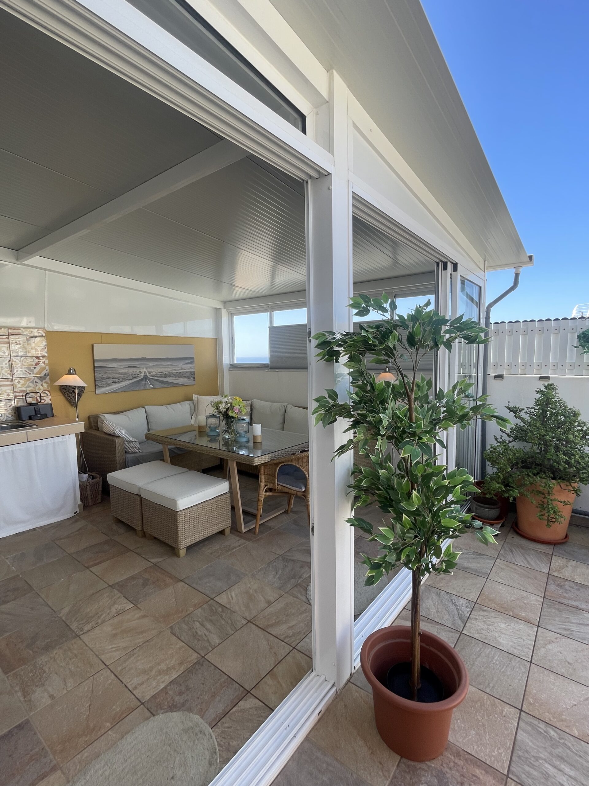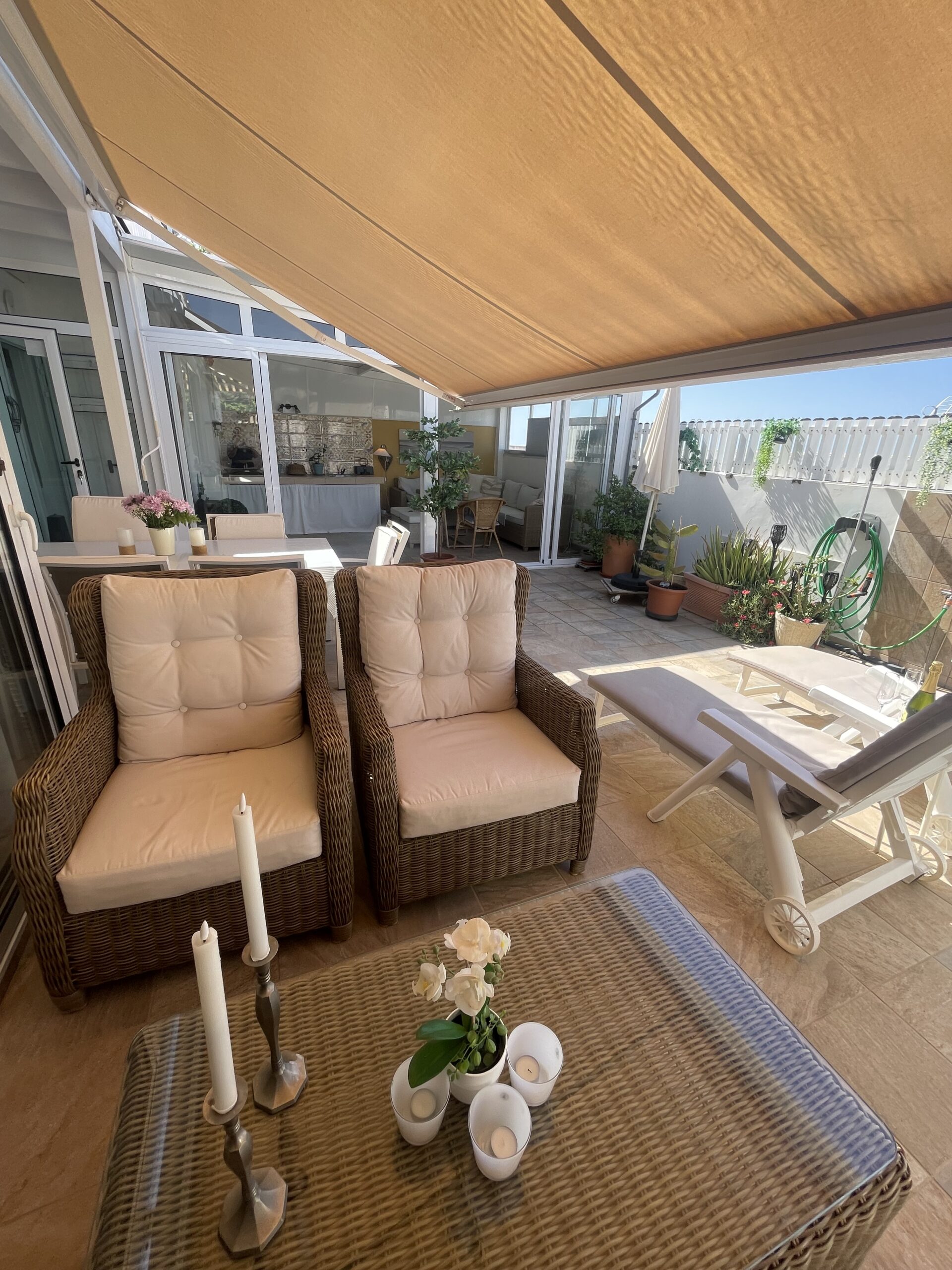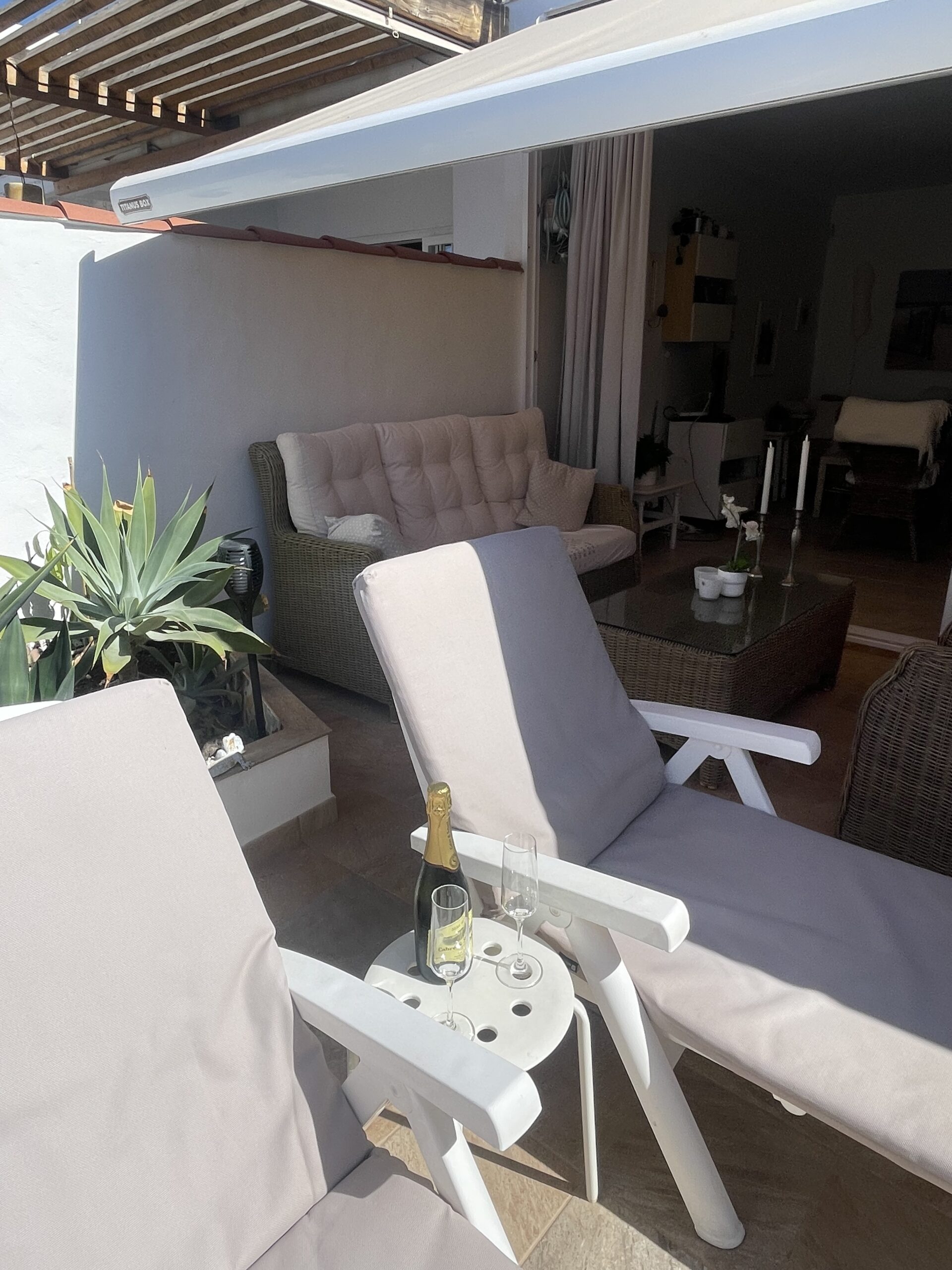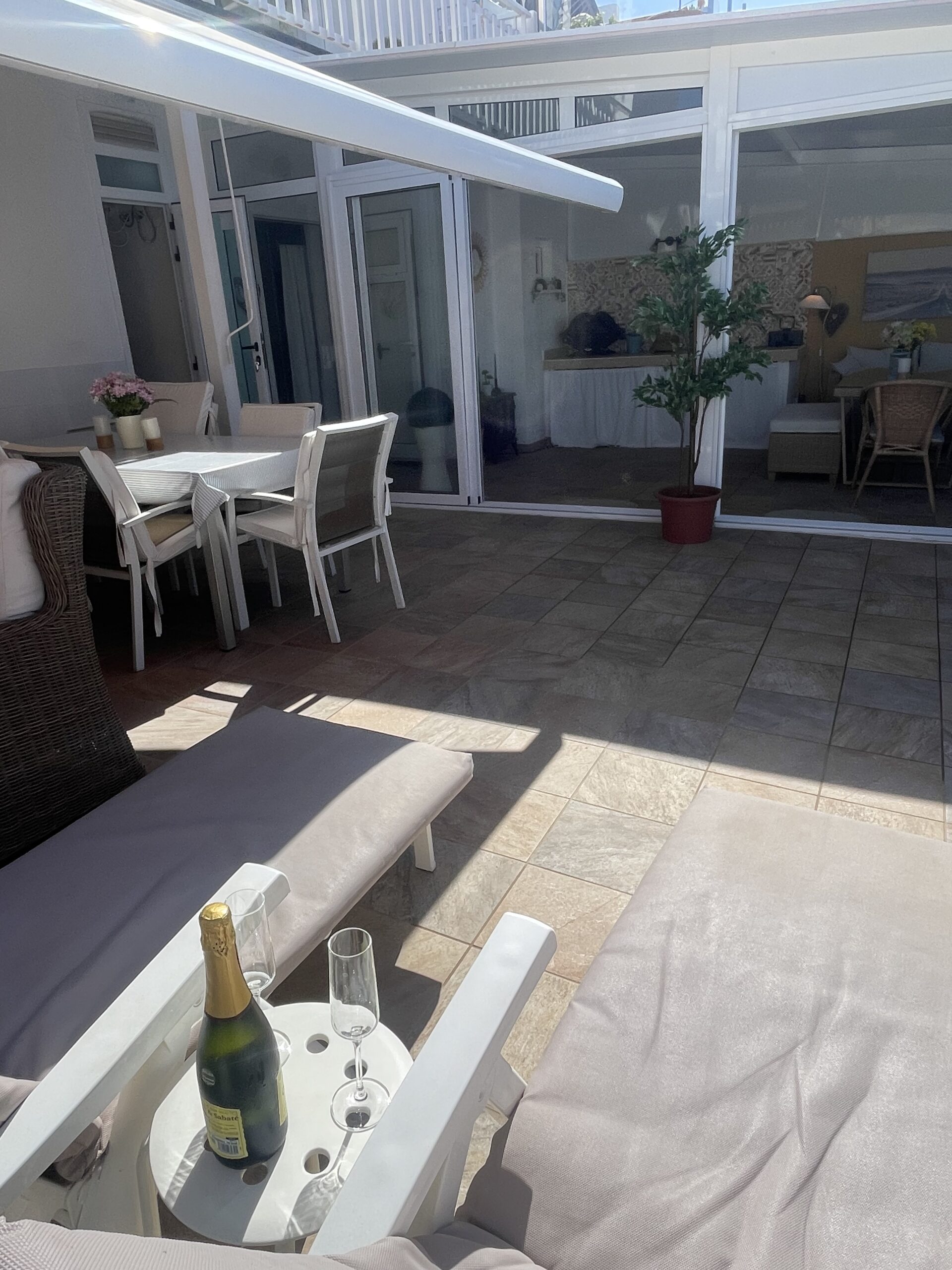 -Stor, flott terrasse i første etasje med loungegruppe, spiseplass og solsenger. Terrassen er skjermet og har inngang til vinterhagen hvor man kan trekke inn for lune kvelder.