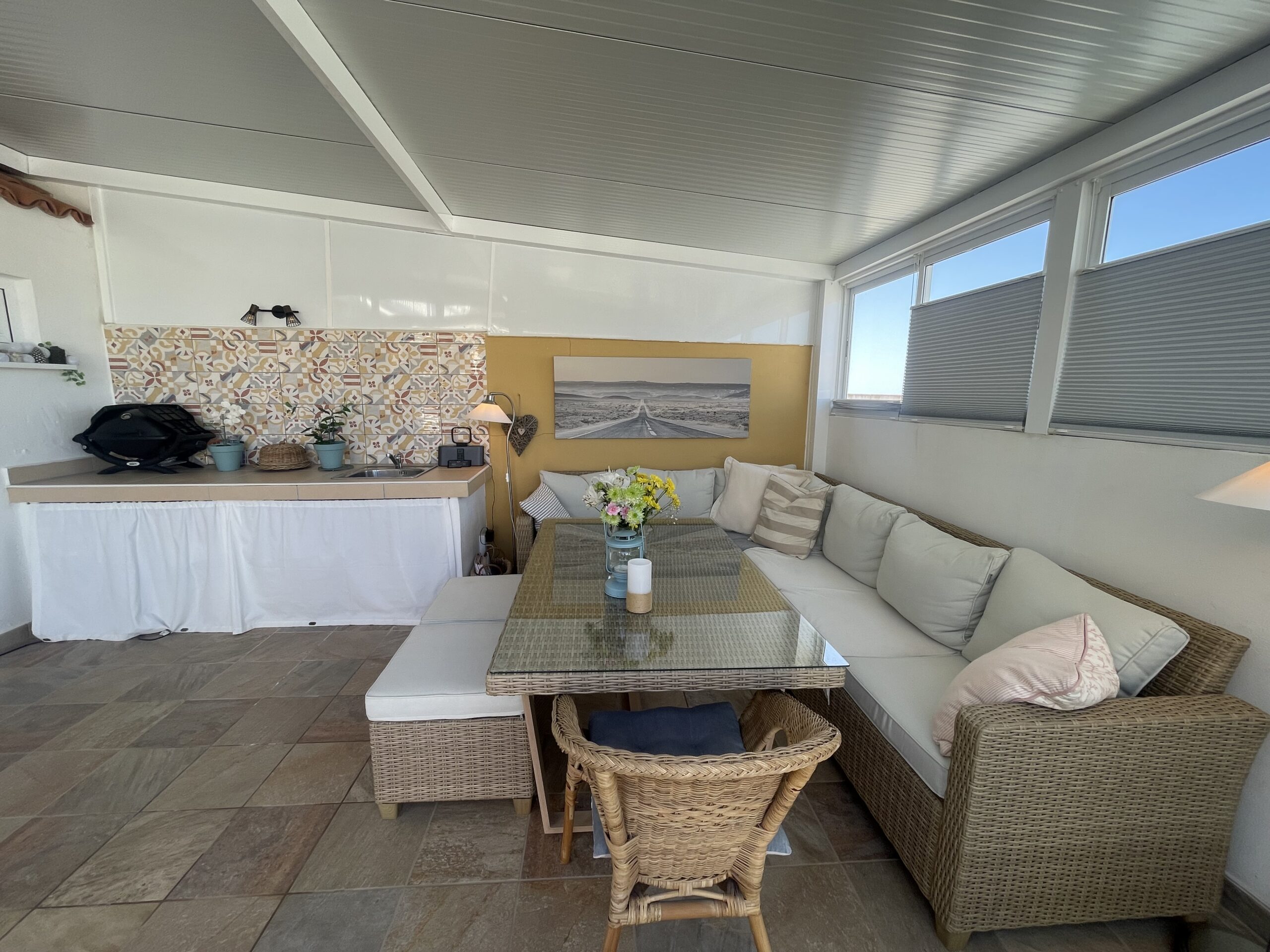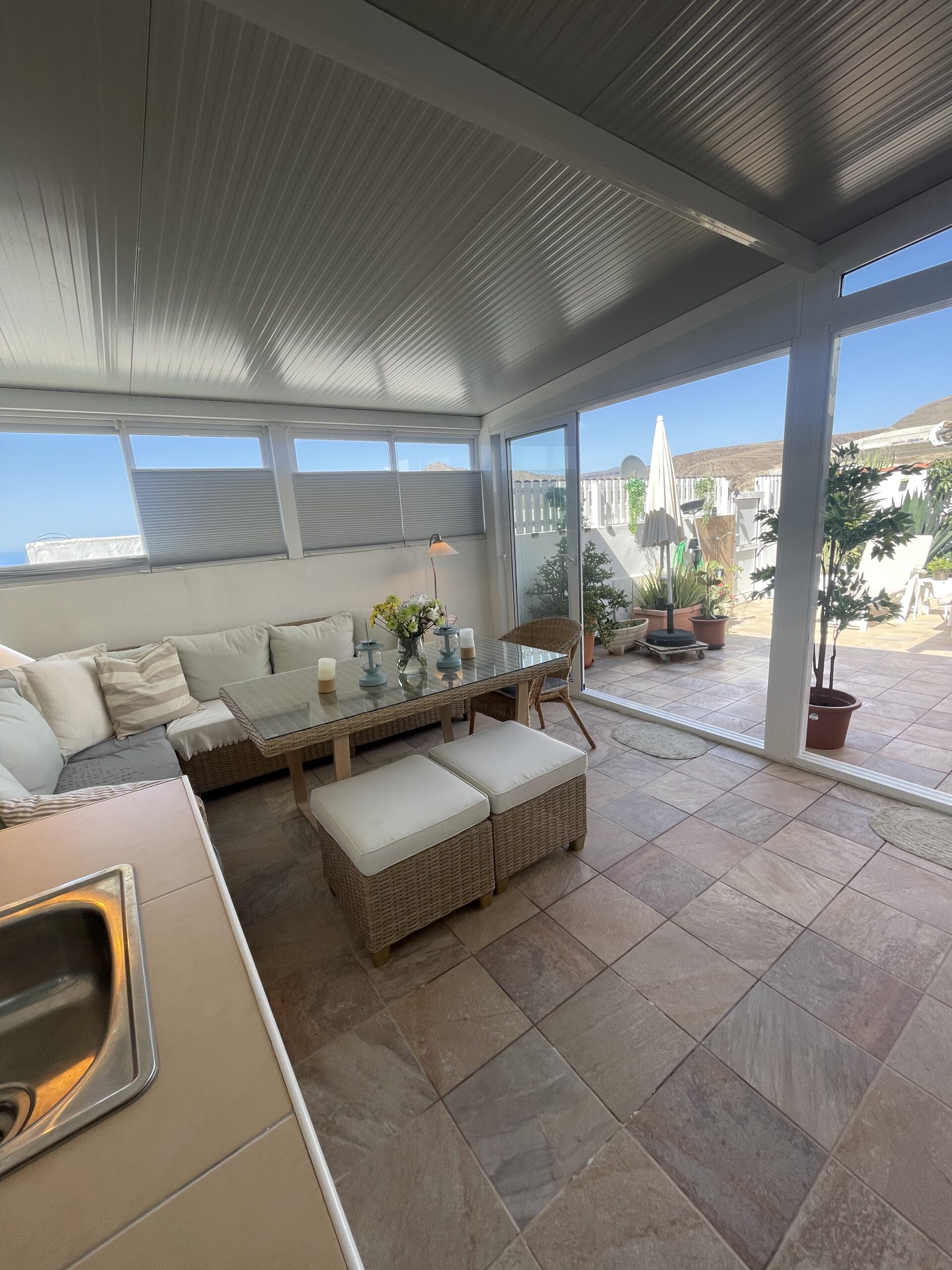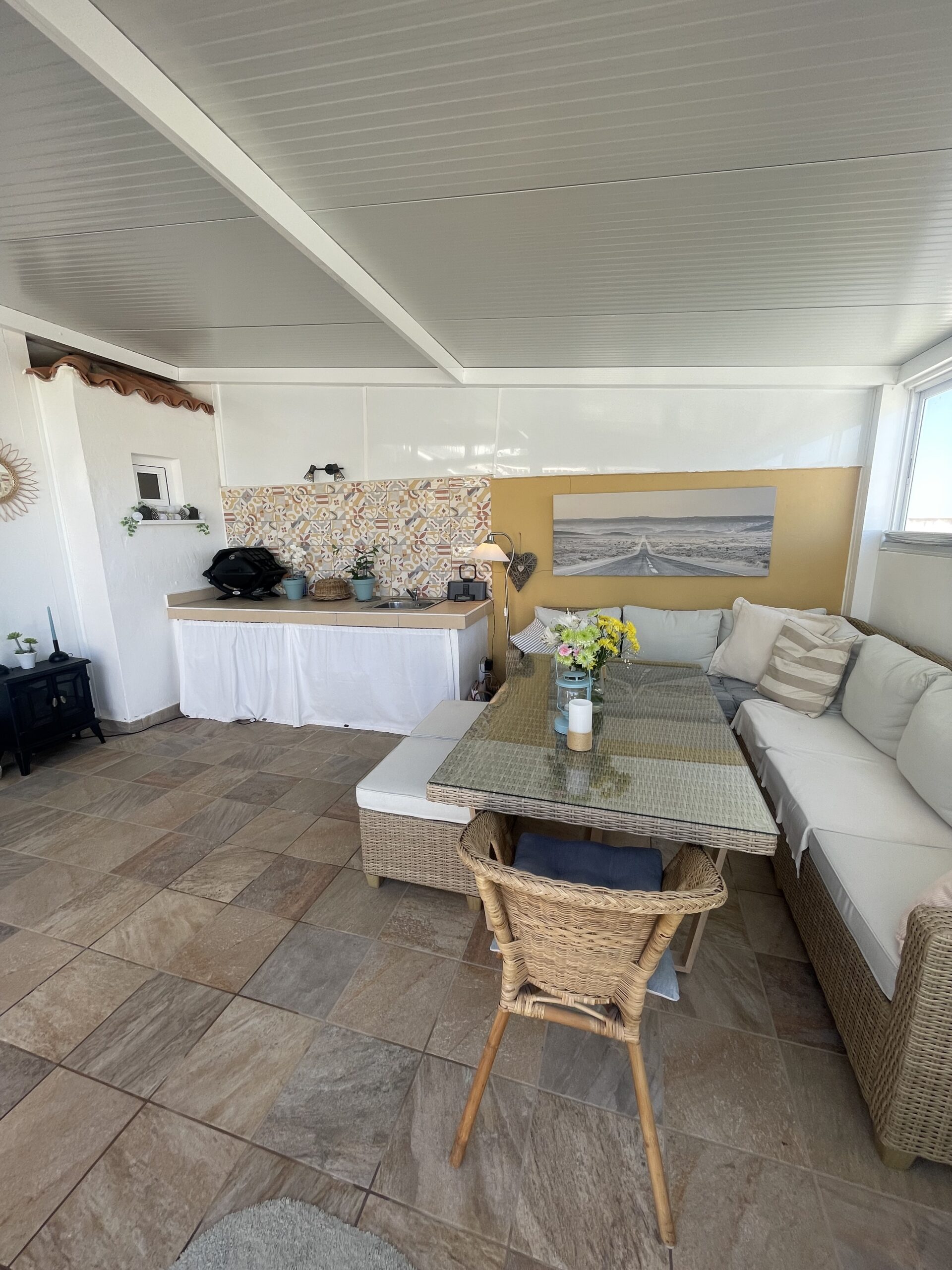 -Påbygget skjermet og stor vinterhage med gardiner og skyvedører ut mot terrassen. Vinterhagen har også et lite utekjøkken og elektrisk peis. Dette rommet kan om ønskelig benyttes som et ekstra soverom, men har ingen senger per i dag.