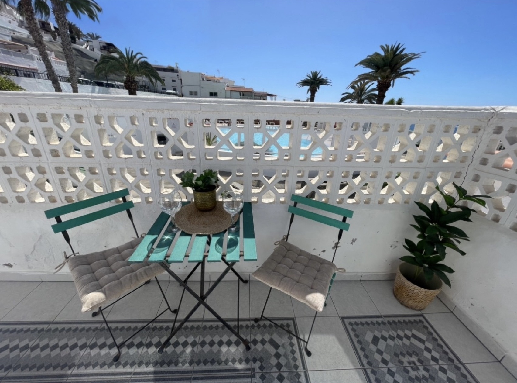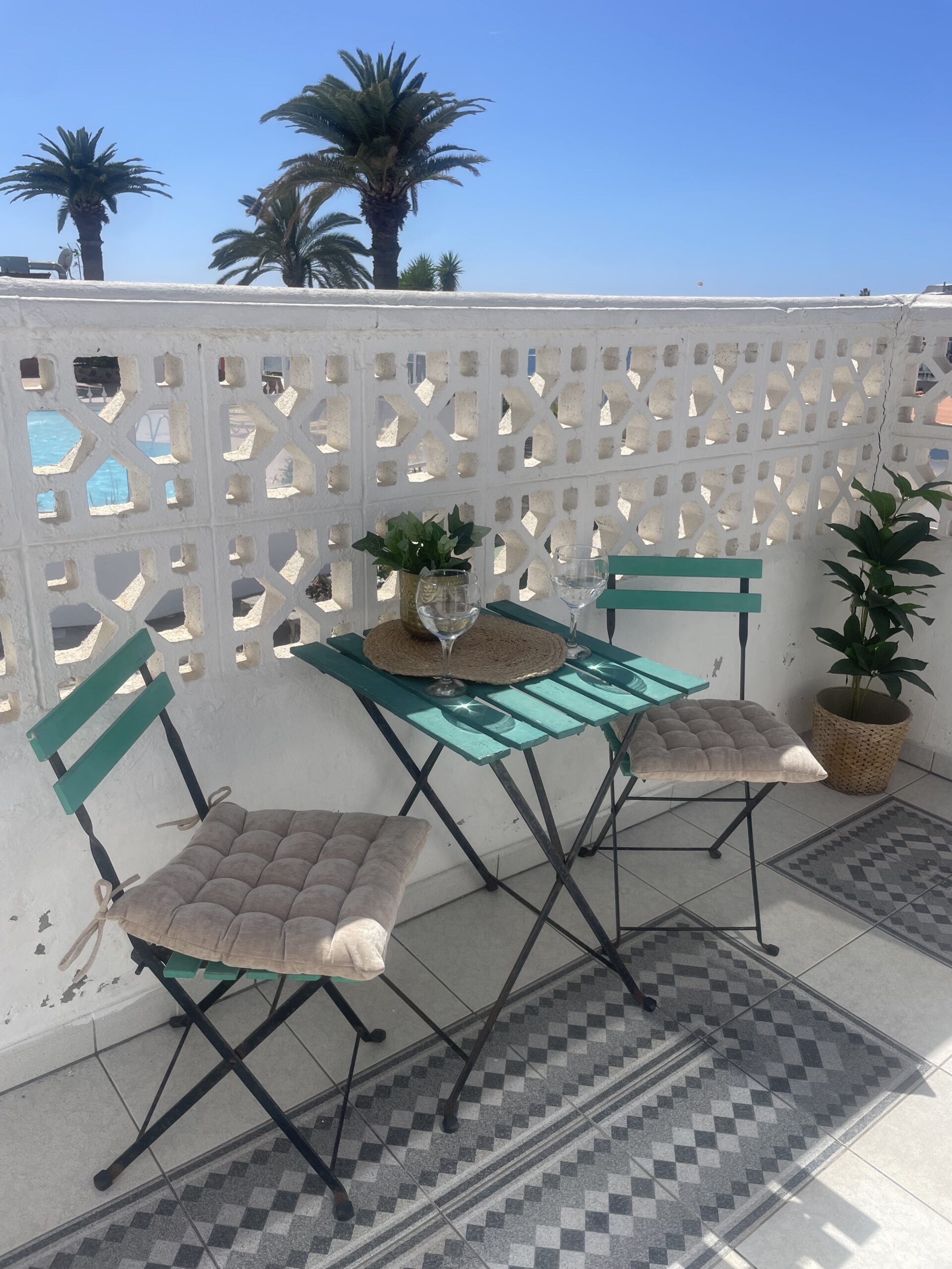 -Terrasse med liten sittegruppe med flott havutsikt og utsikt til bassengområdet