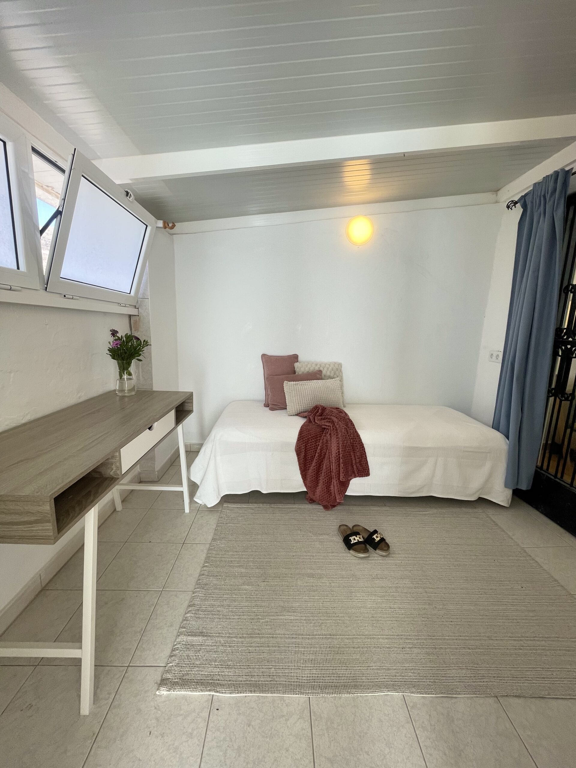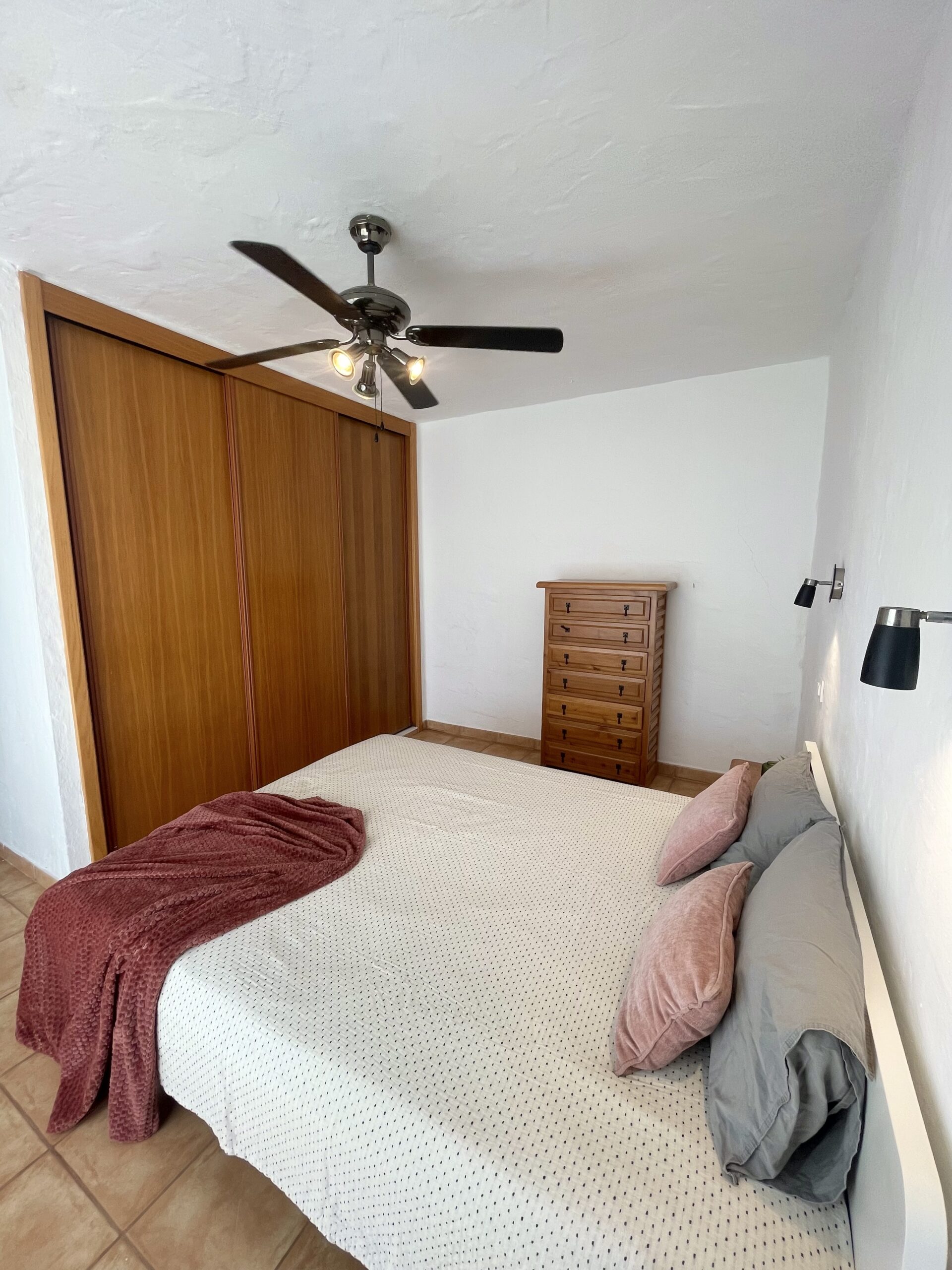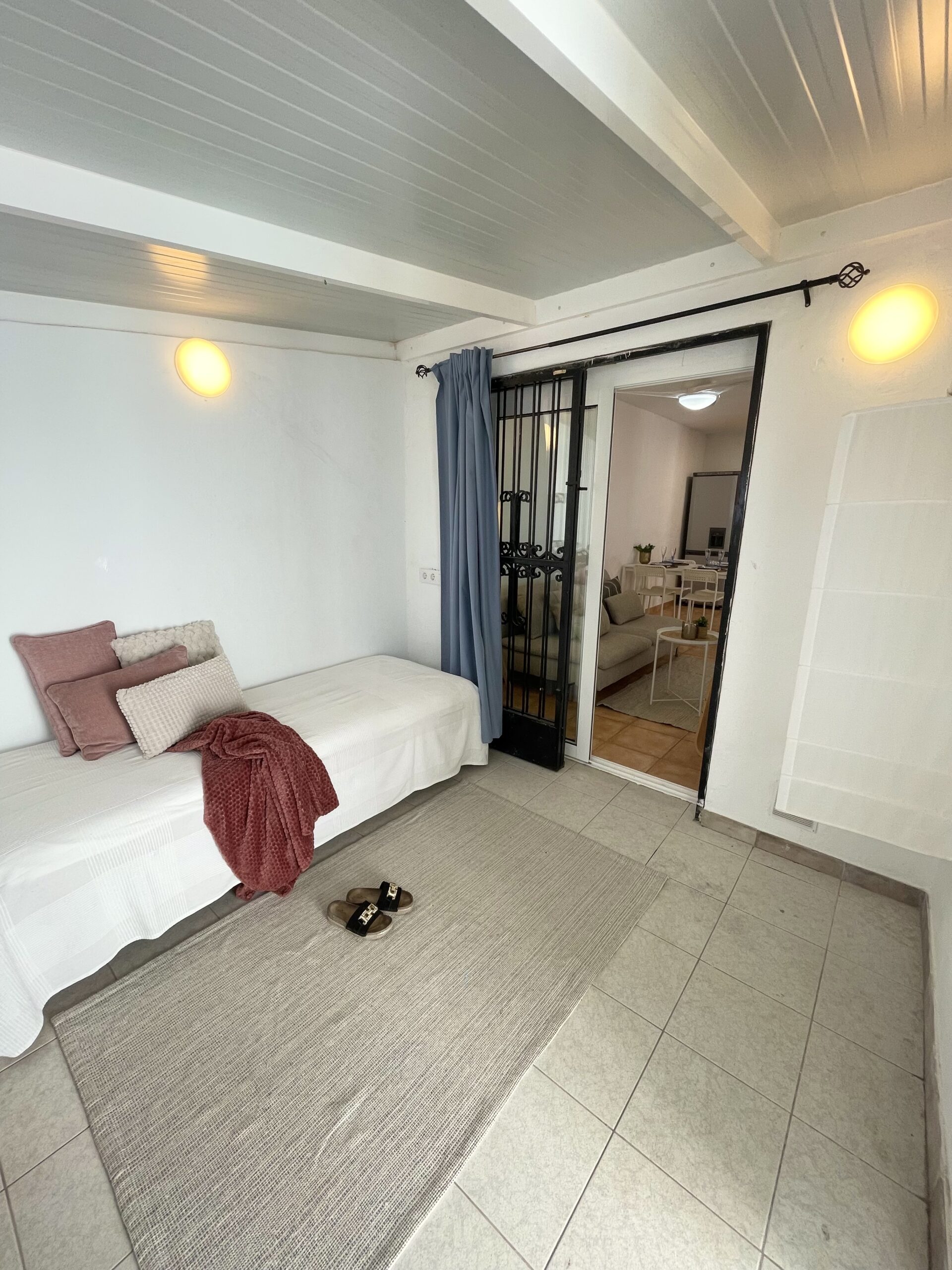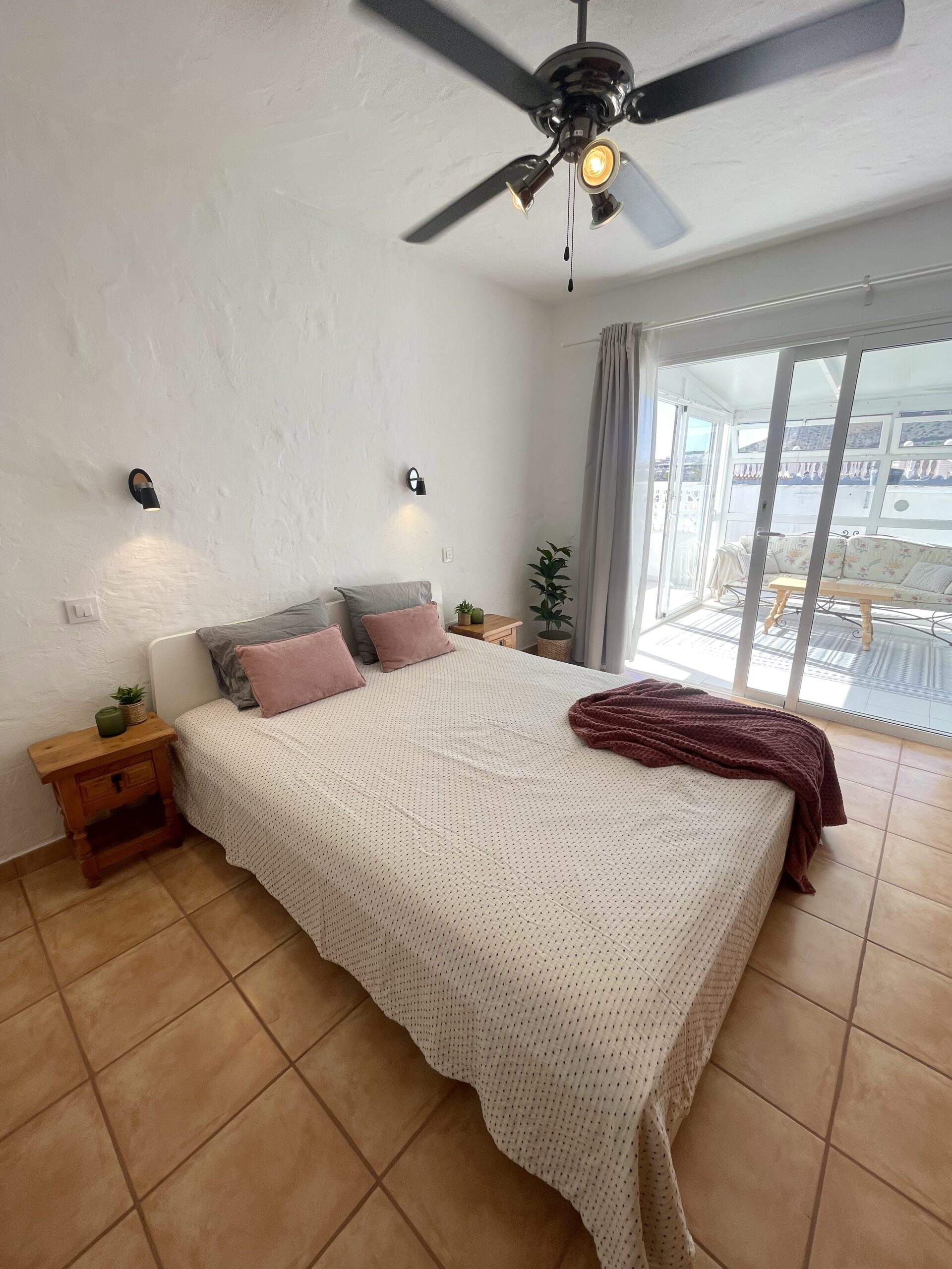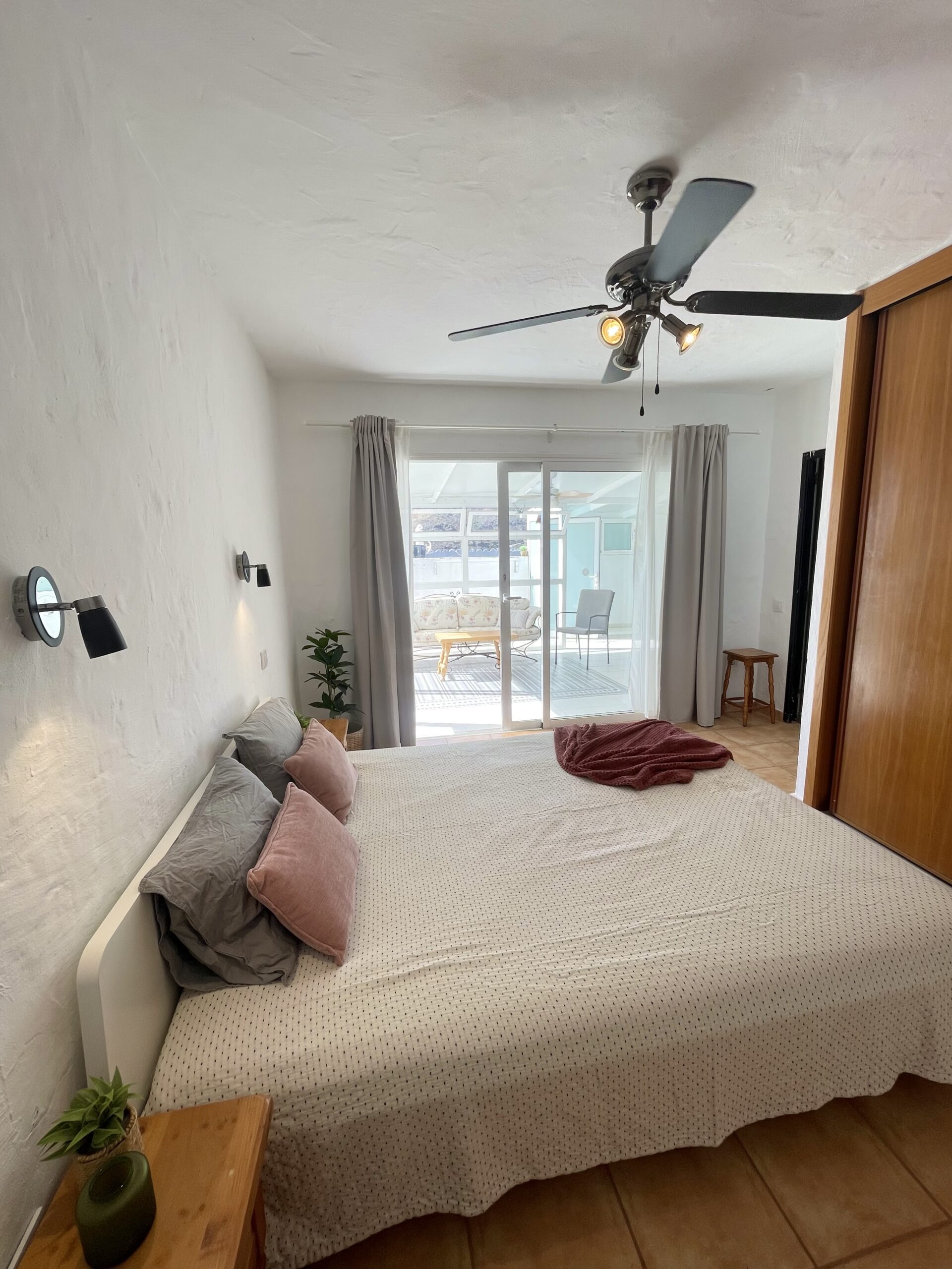 -2 soverom: Hovedsoverom med dobbeltseng, stor skyvedørsgarderobe, vifte i taket og utgang til utestue. Soverom to har skrivepult og to enkeltsenger som enkelt kan settes sammen til dobbeltseng. Rommet har utgang til terrassen.