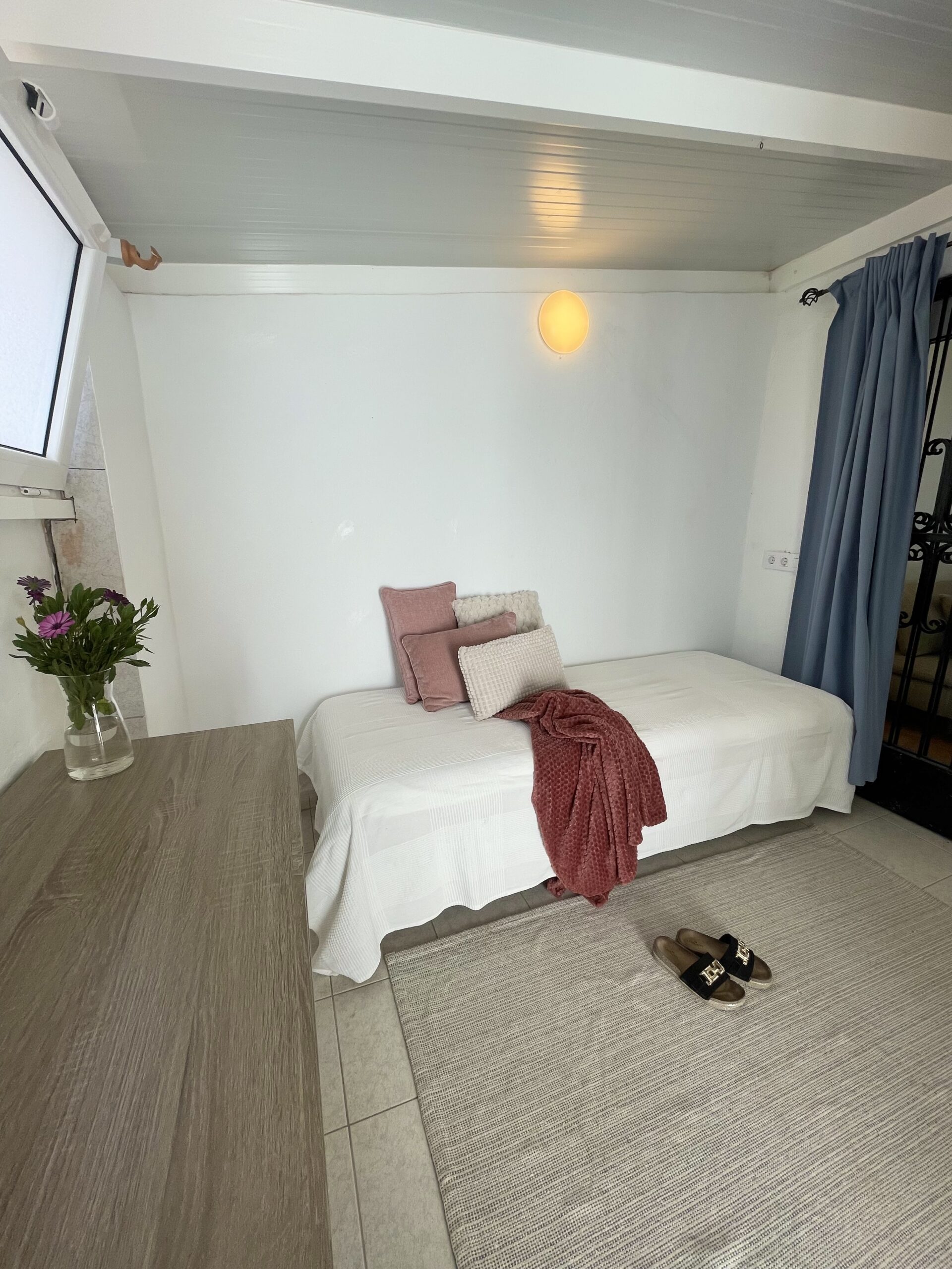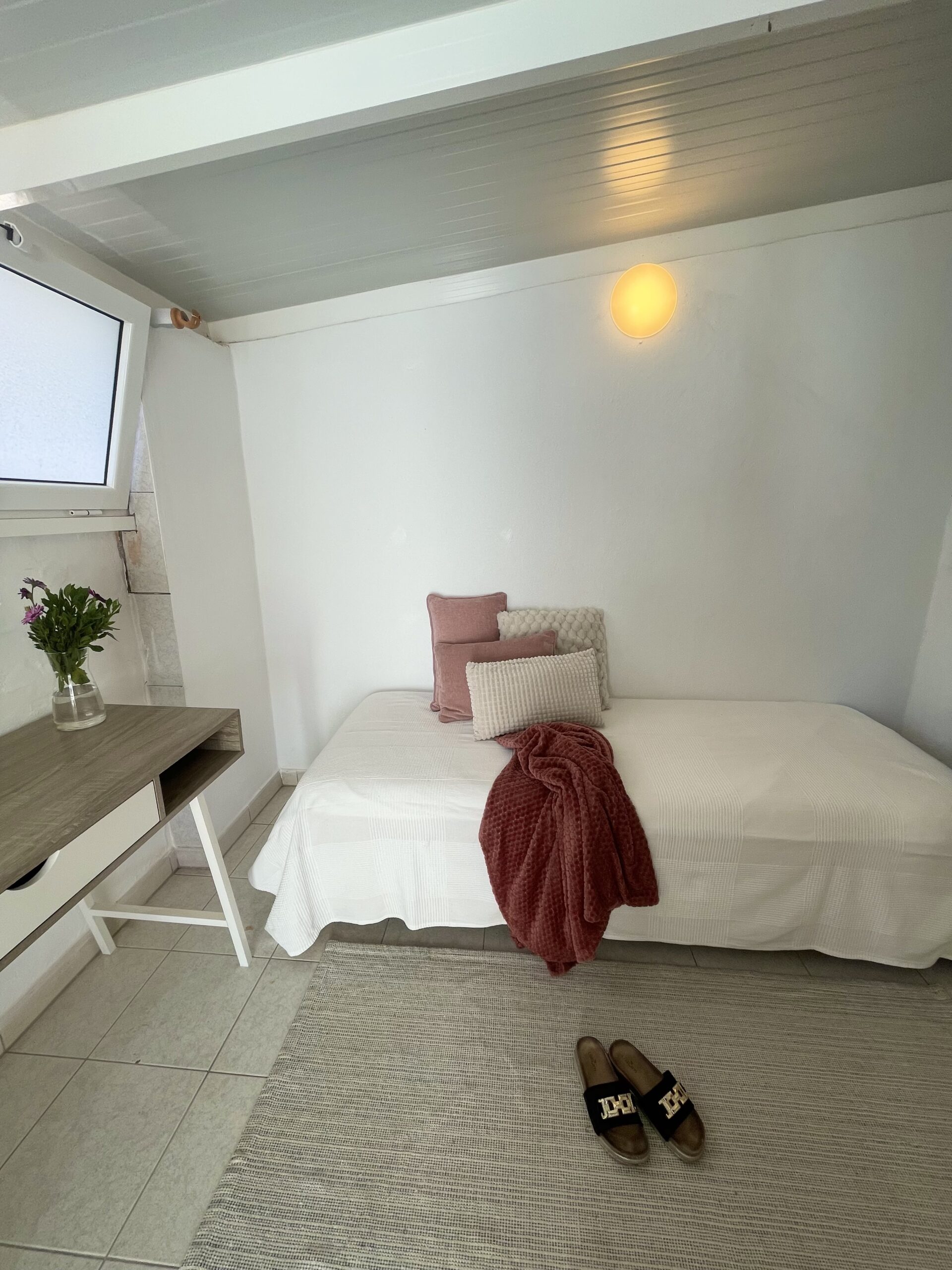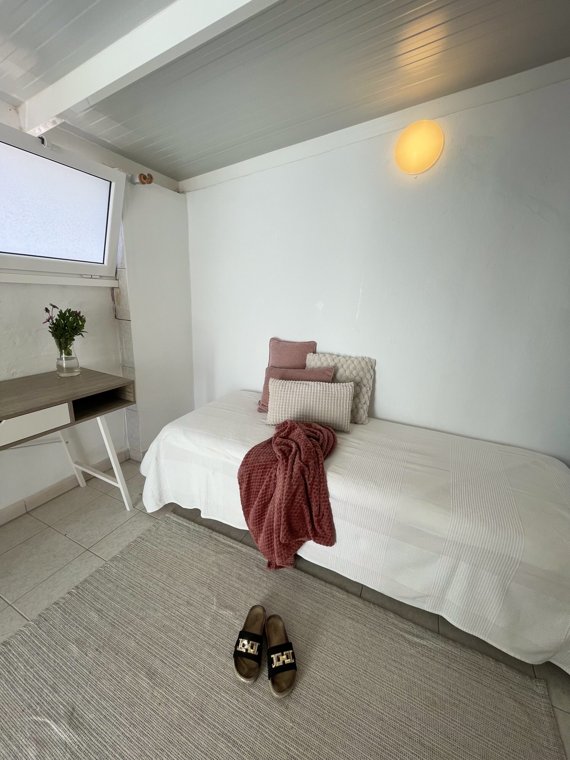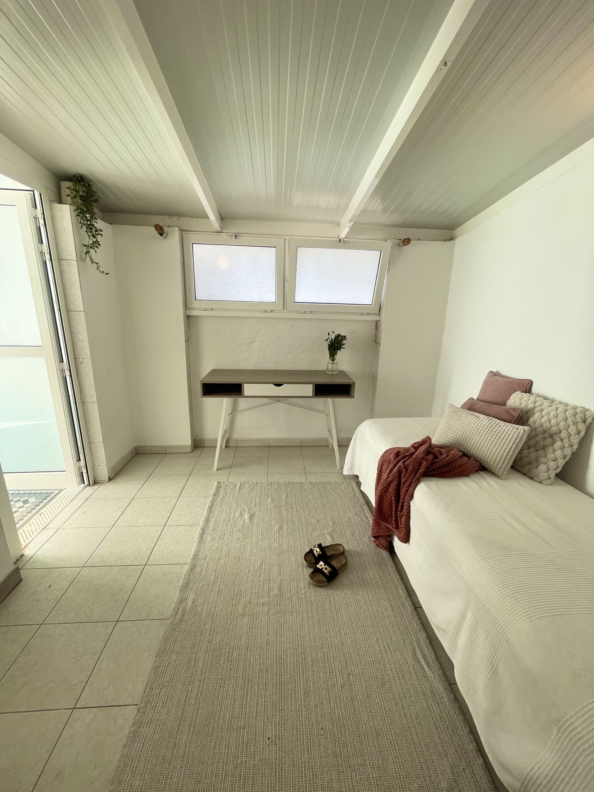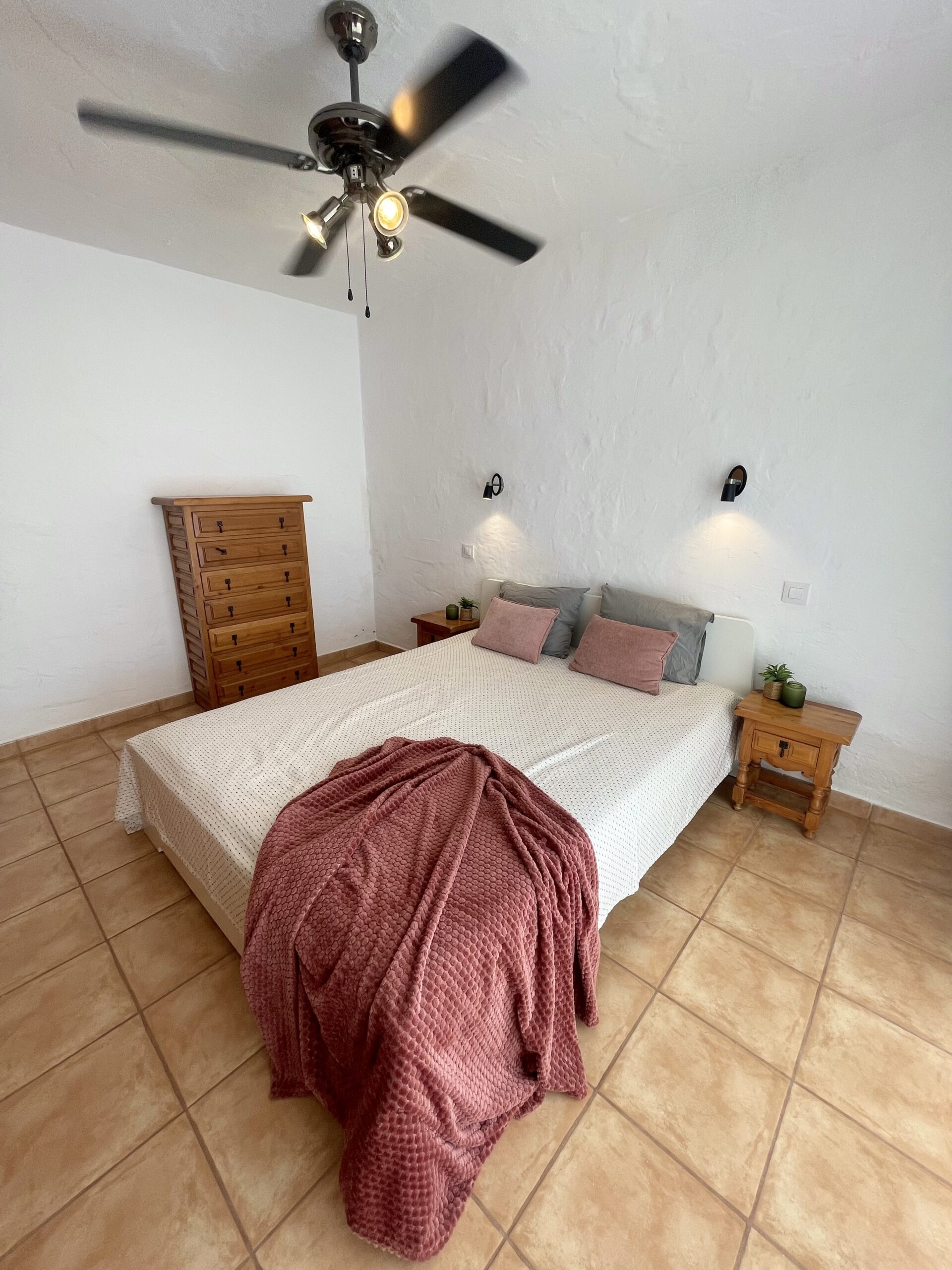 -2 soverom: Hovedsoverom med dobbeltseng, stor skyvedørsgarderobe, vifte i taket og utgang til utestue. Soverom to har skrivepult og to enkeltsenger som enkelt kan settes sammen til dobbeltseng. Rommet har utgang til terrassen.