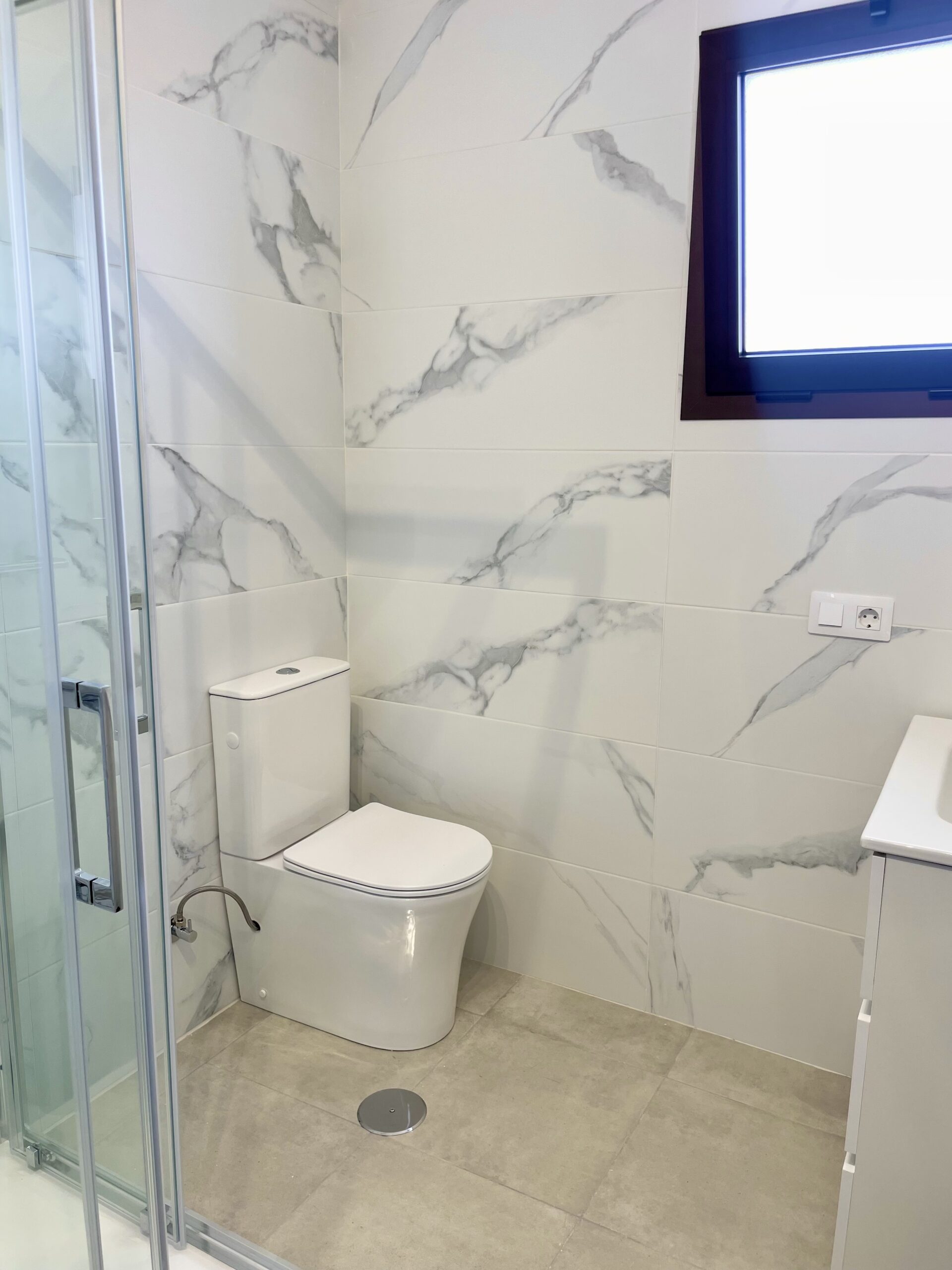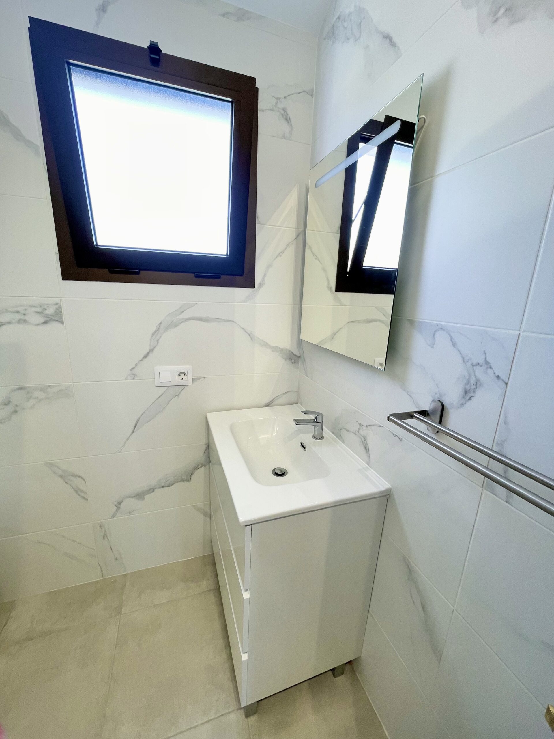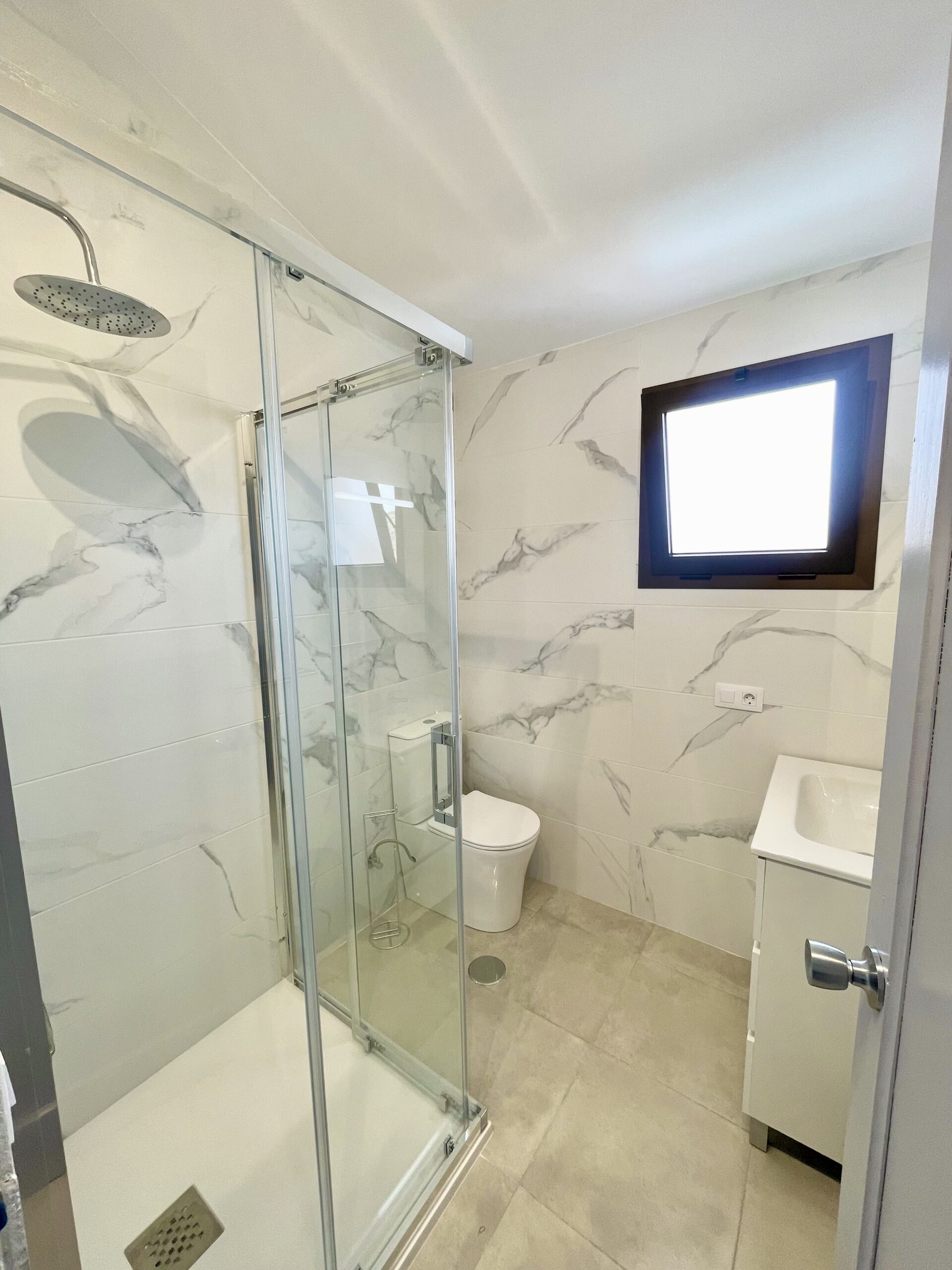 – Lekkert bad med dusj, toalett og servant med skuffer og speil