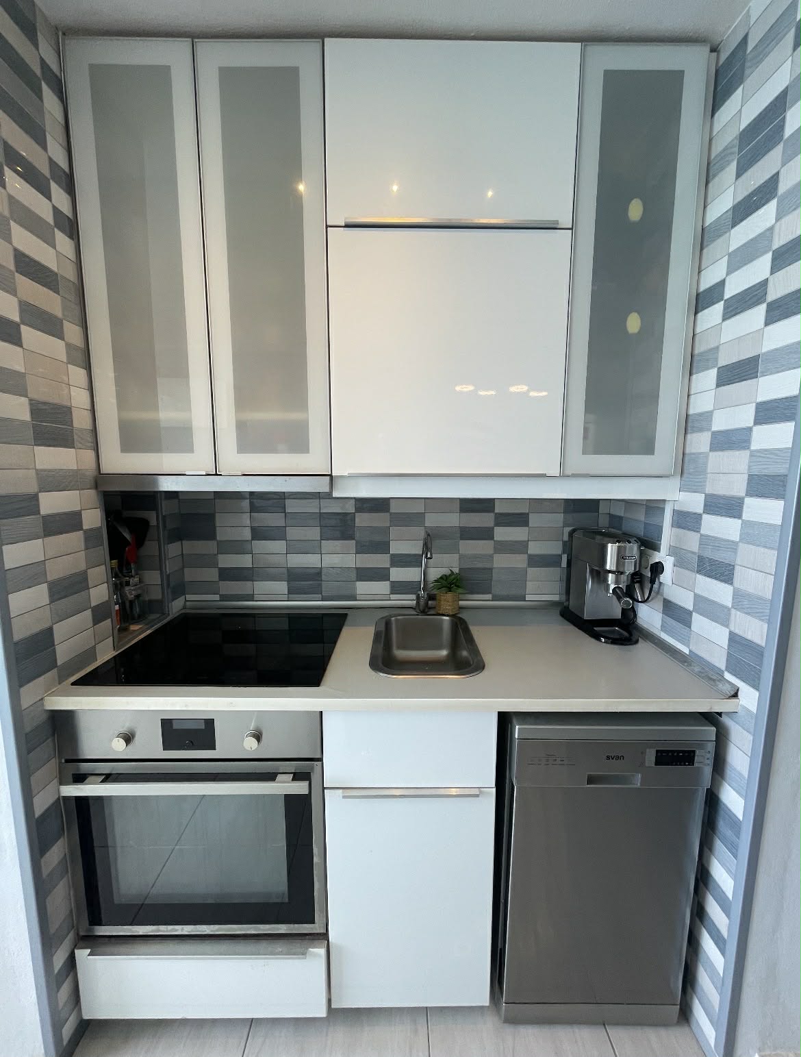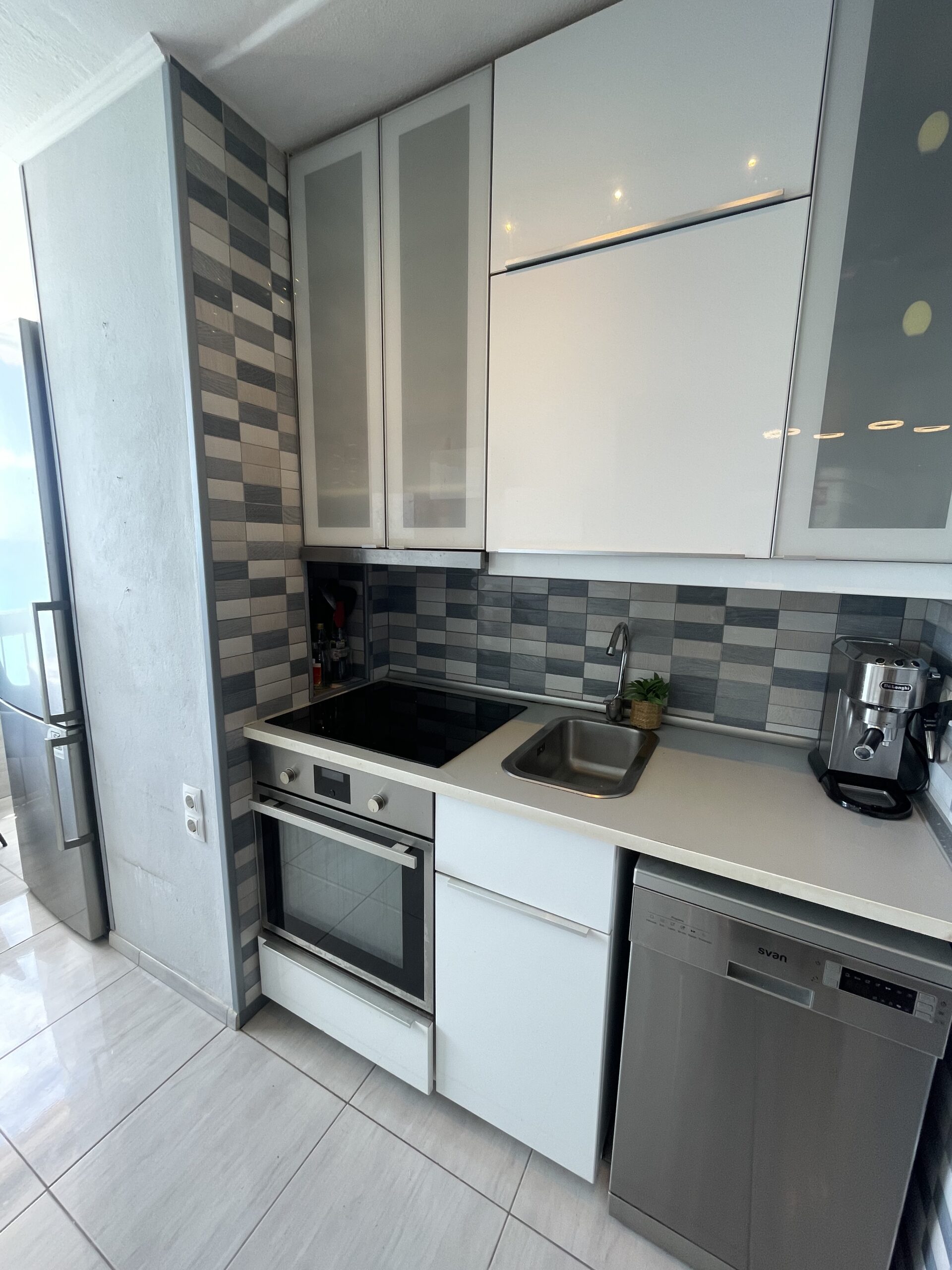 -Moderne kjøkken med stekeovn med kokeplater, oppvaskmaskin og stort kjøleskap med frysedel