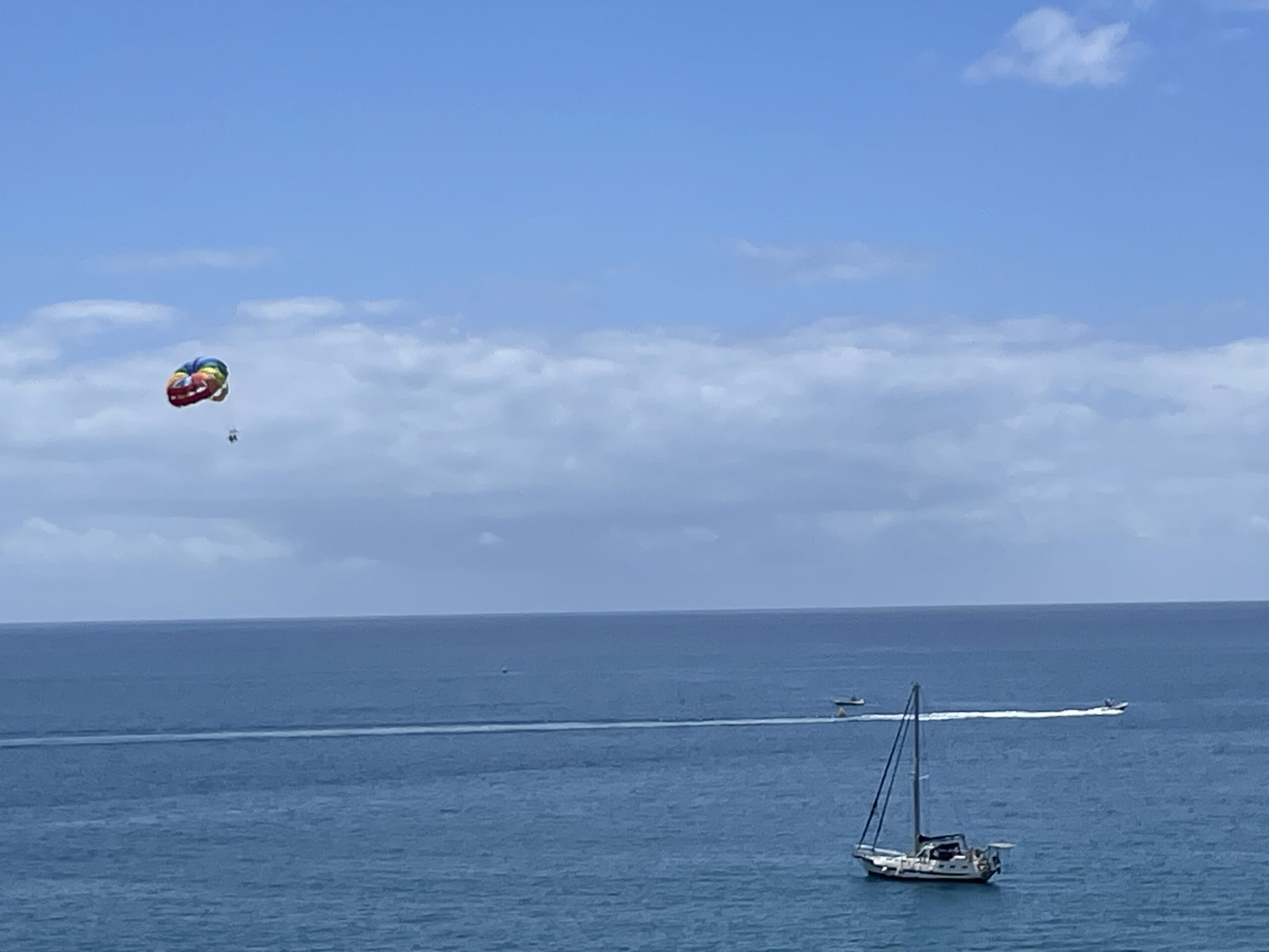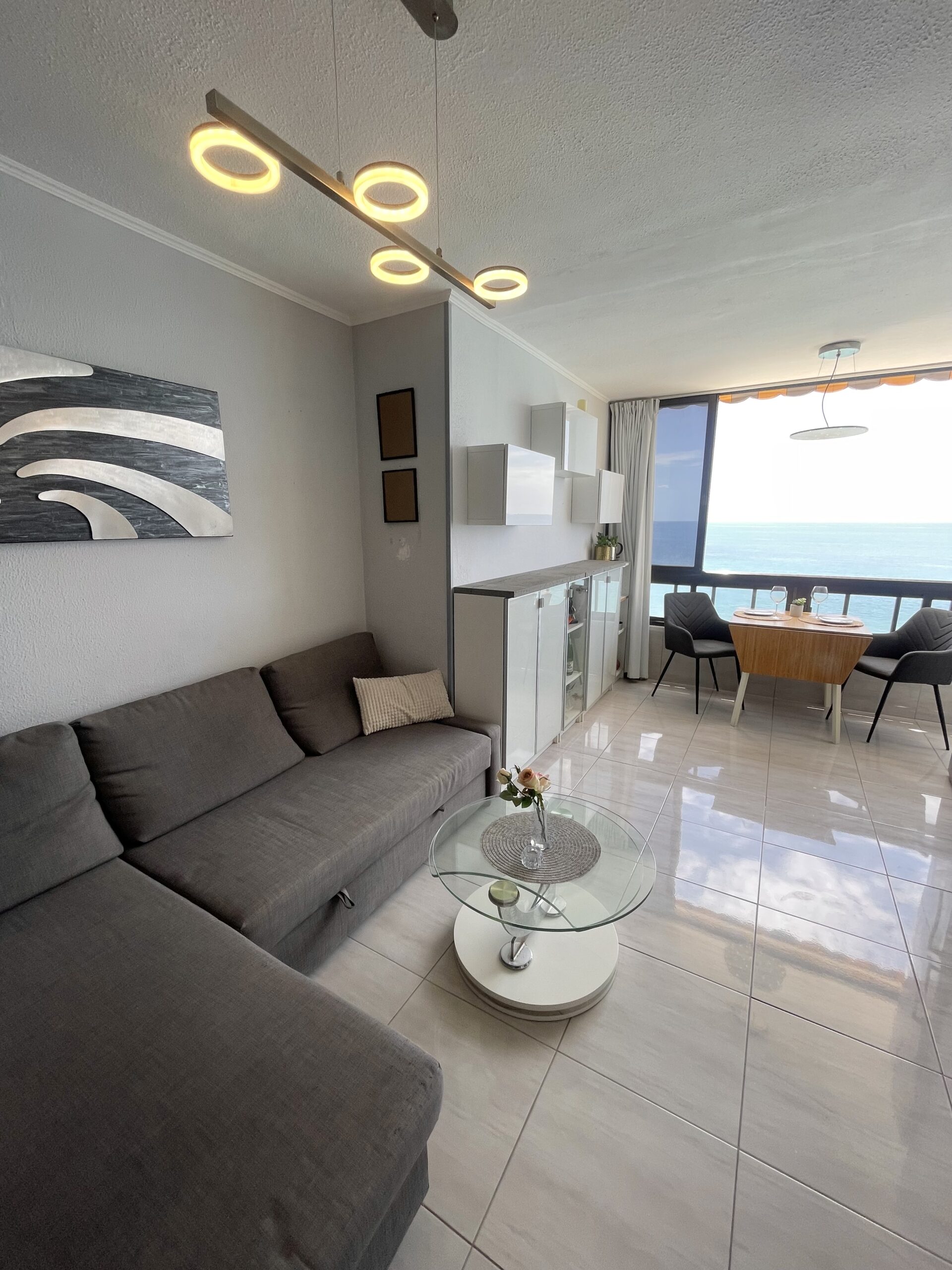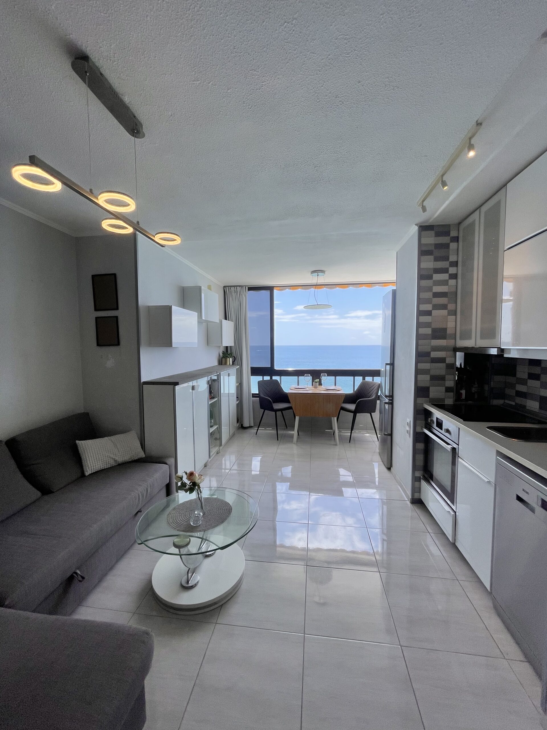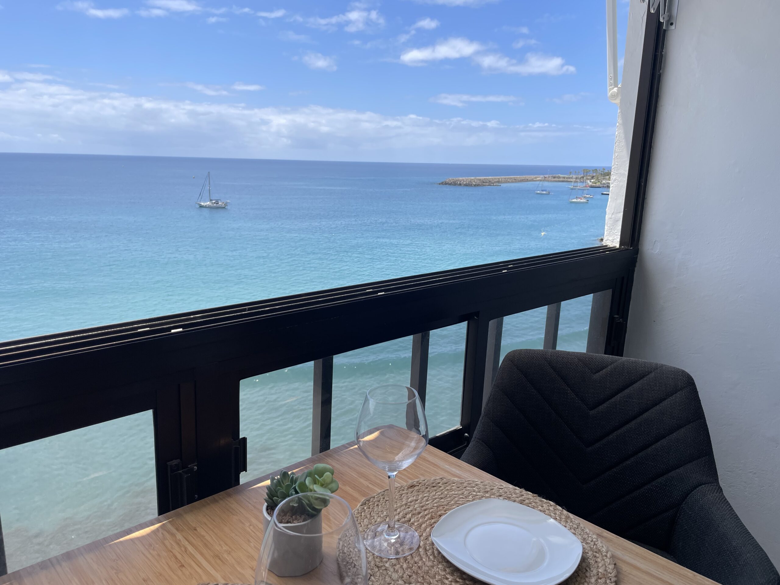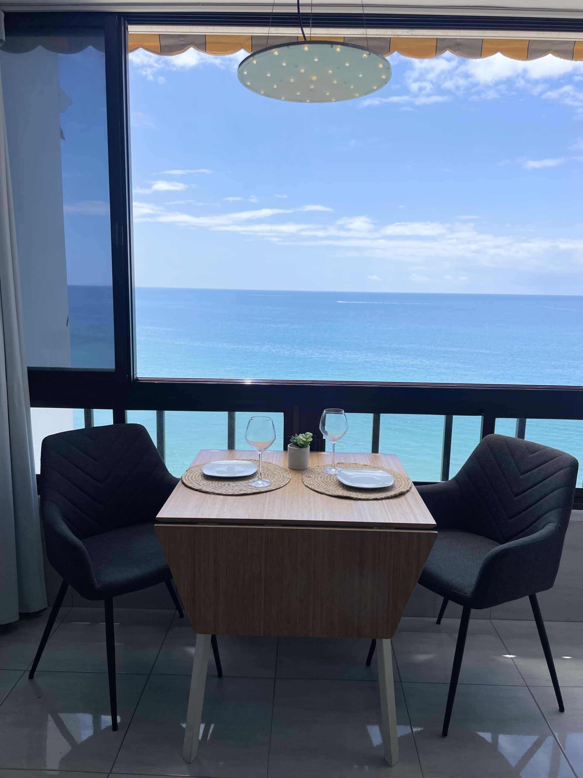 Leiligheten har ikke en egen balkong, men store vinduer mot stranden og havet som kan skyves til siden for en herlig ute/inne-følelse. Praktisk markise foran vinduene.