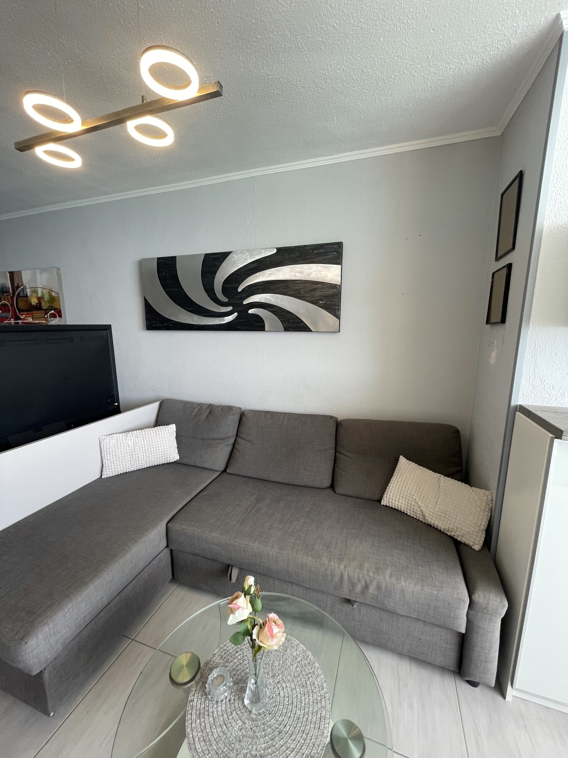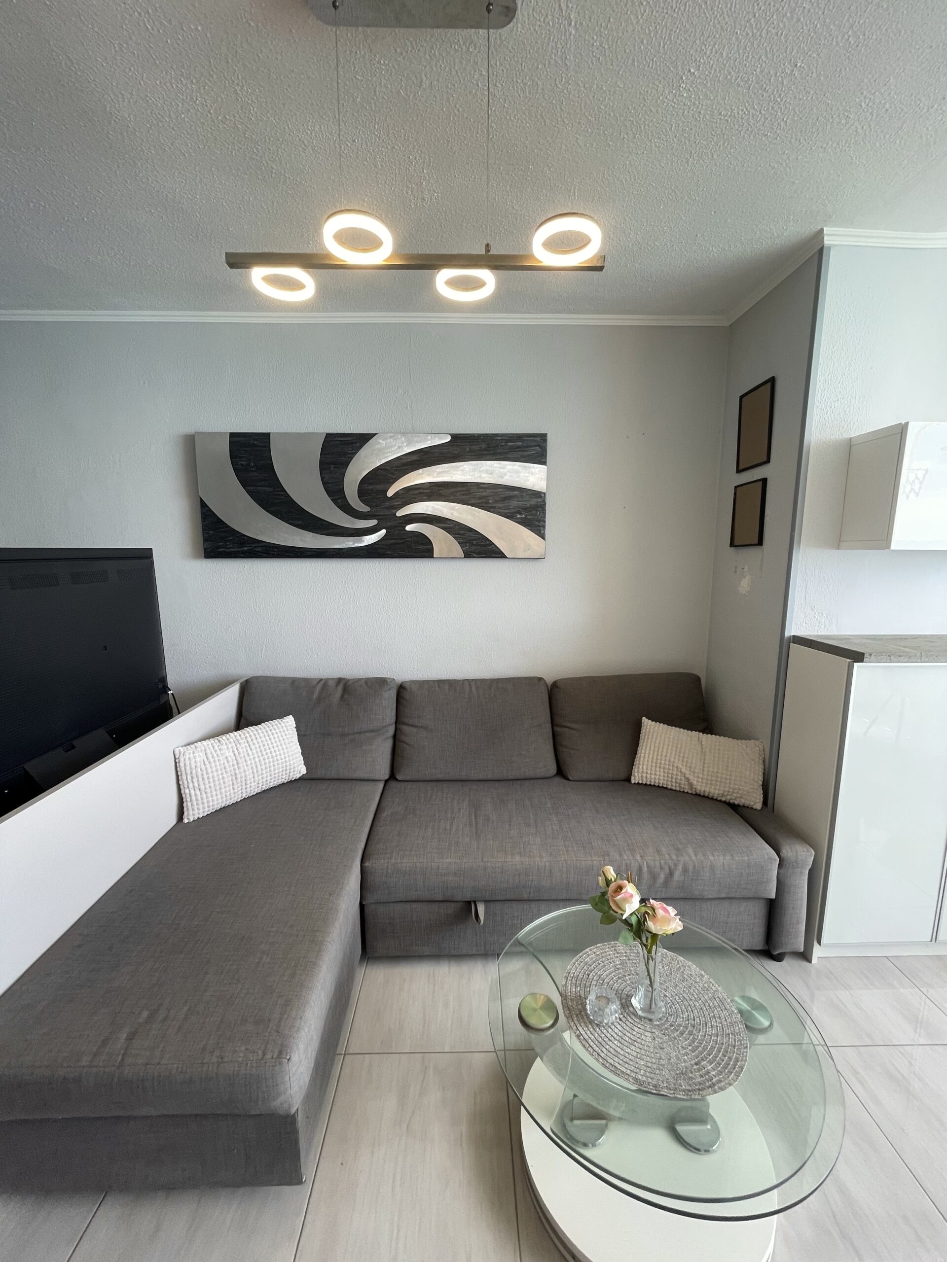 -Åpen stue-/kjøkkenløsning med sovesofa med ekstra sengeplasser, tv, spiseplass og fantastisk havutsikt. Spisebordet kan forlenges noe ved hjelp av to klaffer.