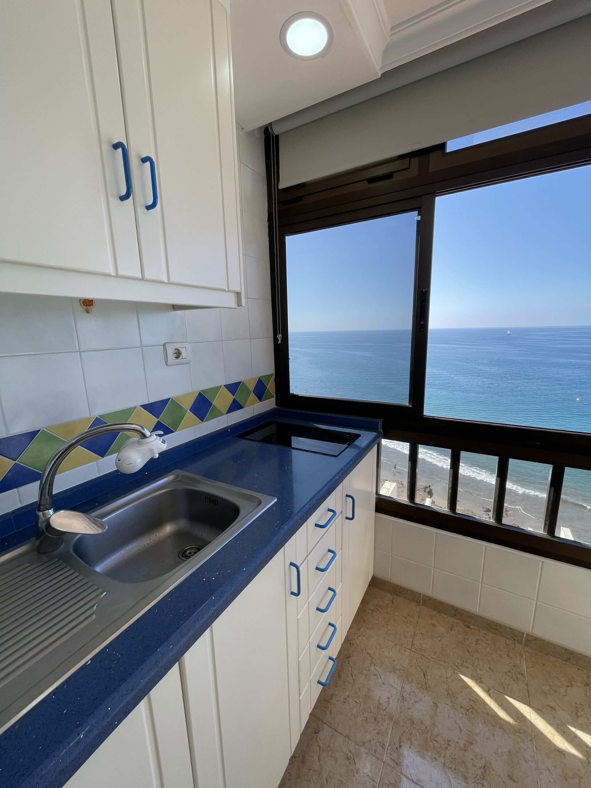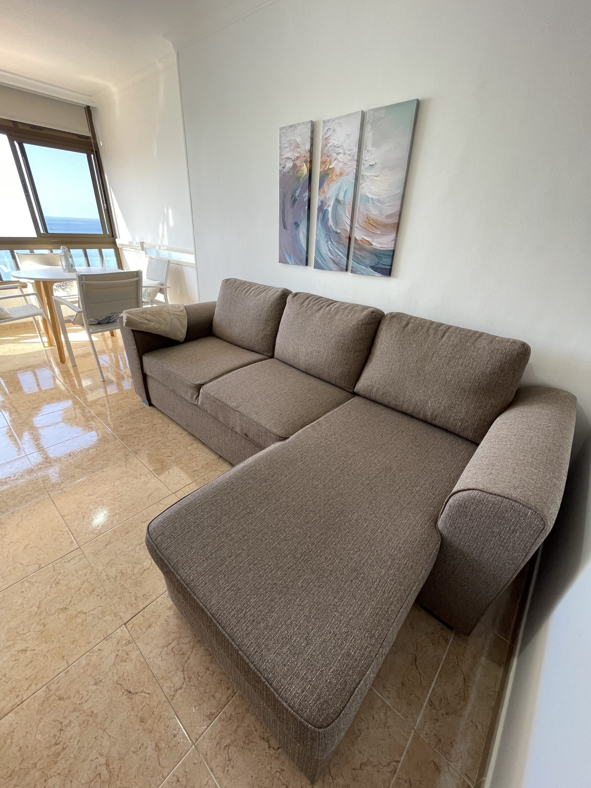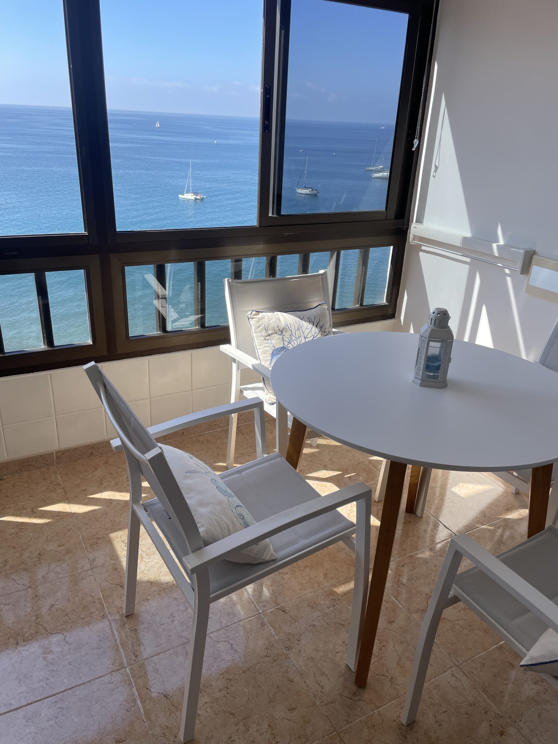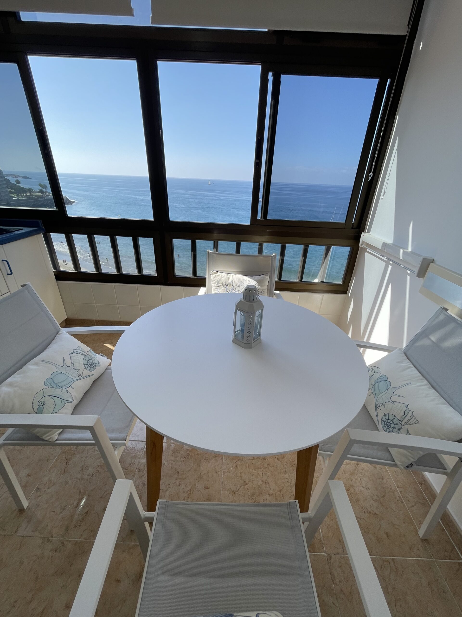 Leiligheten har ikke en egen balkong, men store vinduer mot stranden og havet som kan skyves til siden for en herlig ute/inne-følelse.