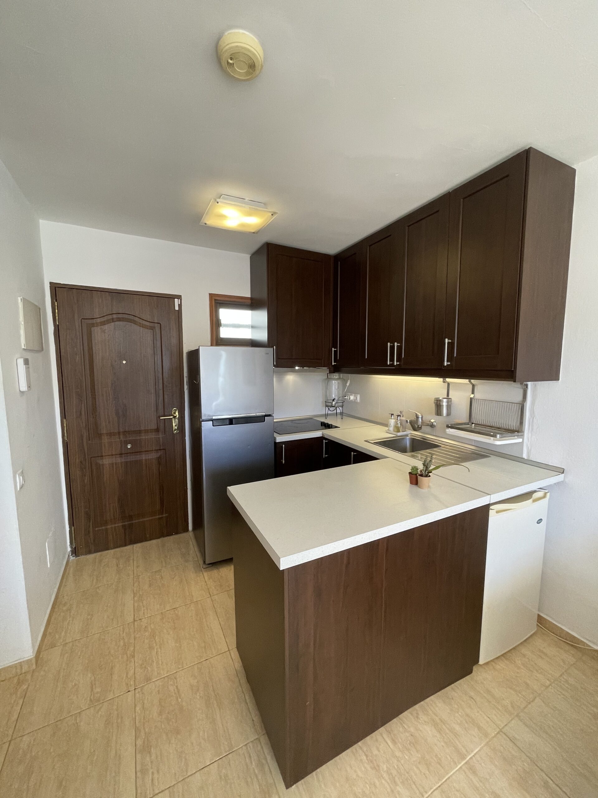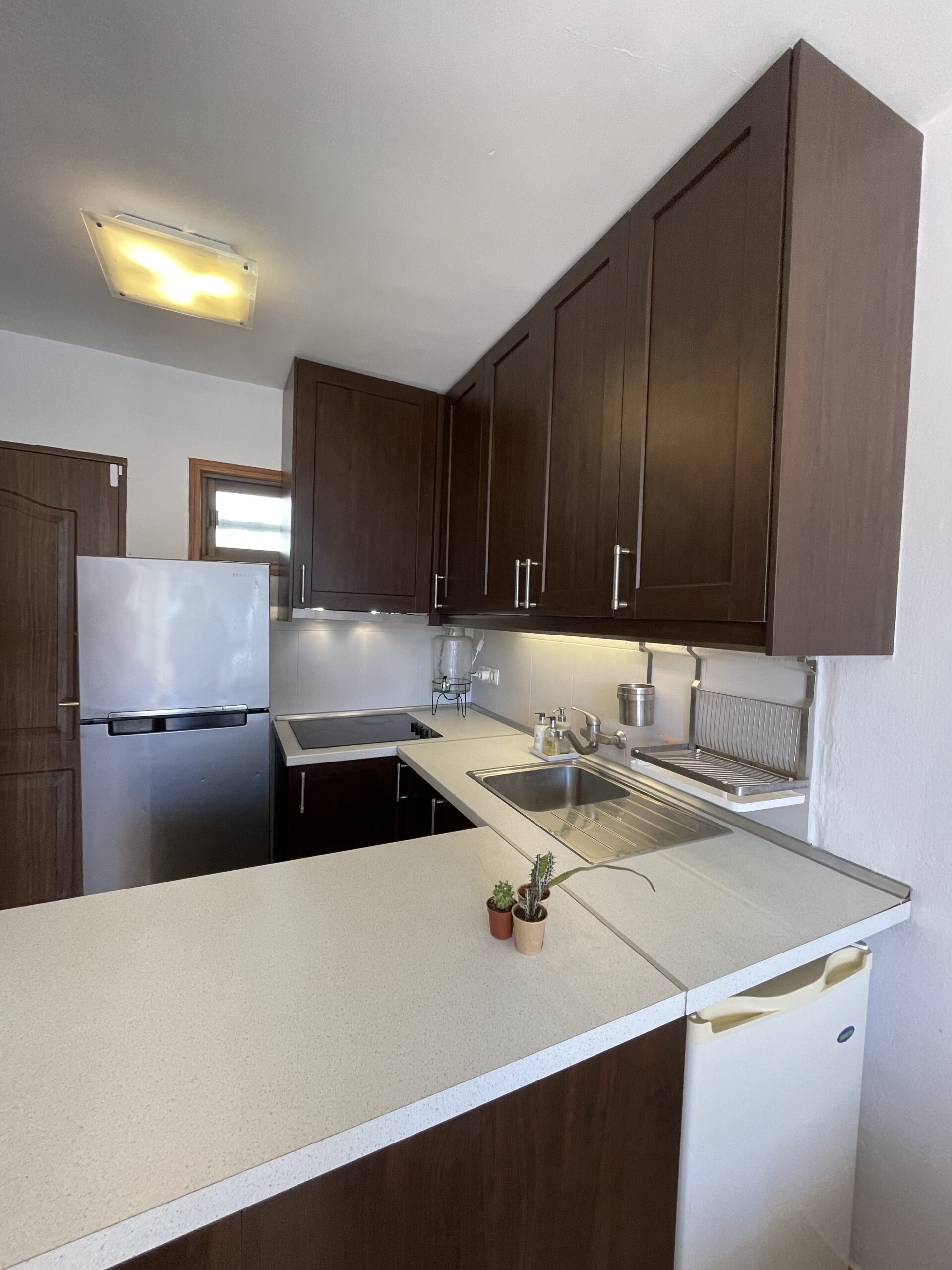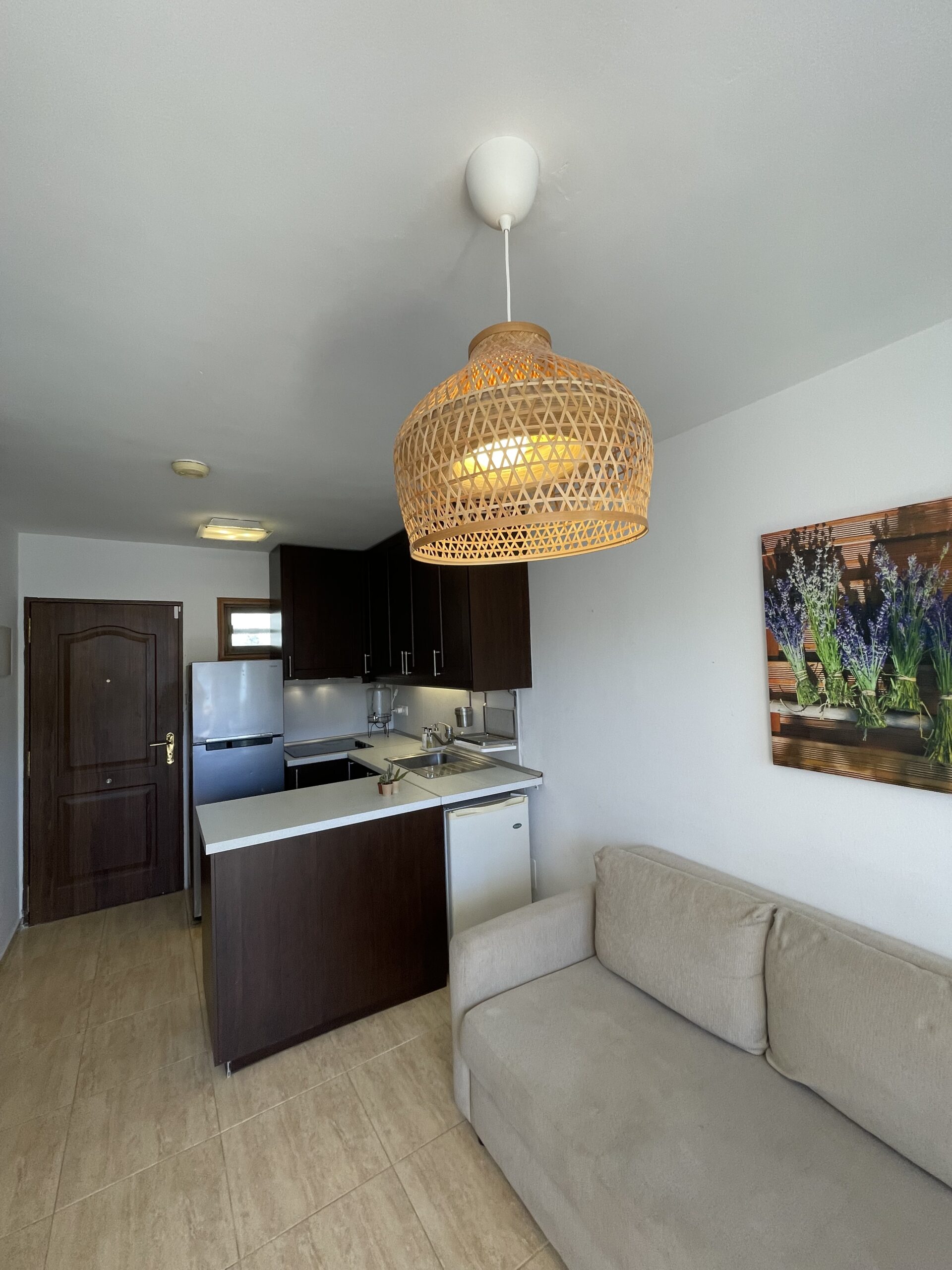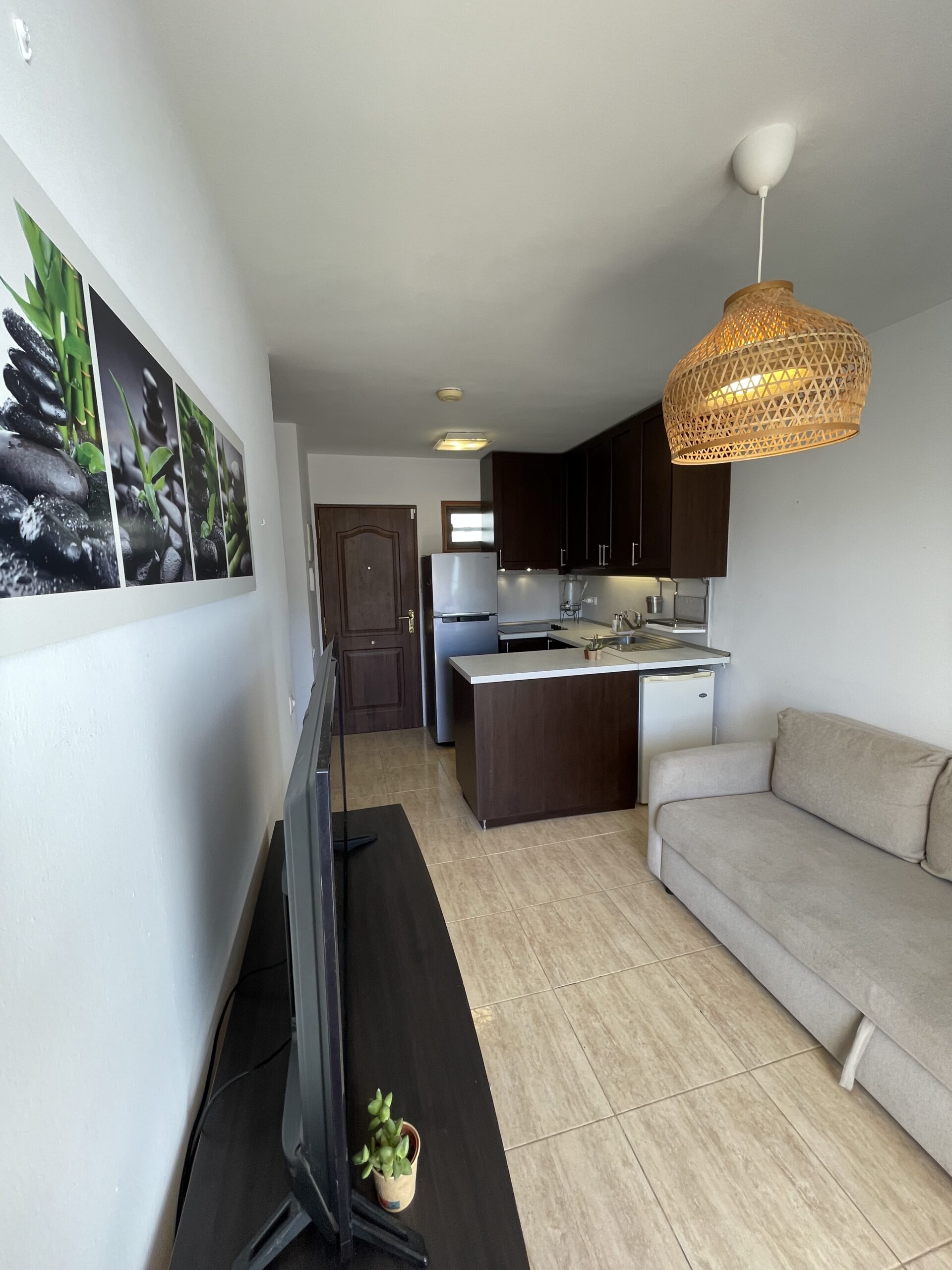 -Åpen stue-/kjøkkenløsning med sofa og tv-område, kjøkken med godt med skap- og benkeplass, stekeovn med kokeplater, kjøleskap med frysedel, og i tillegg et ekstra, lite kjøleskap som er perfekt for drikke. Sofaen i stua er en sovesofa med to ekstra soveplasser. Utgang til balkong fra stua.